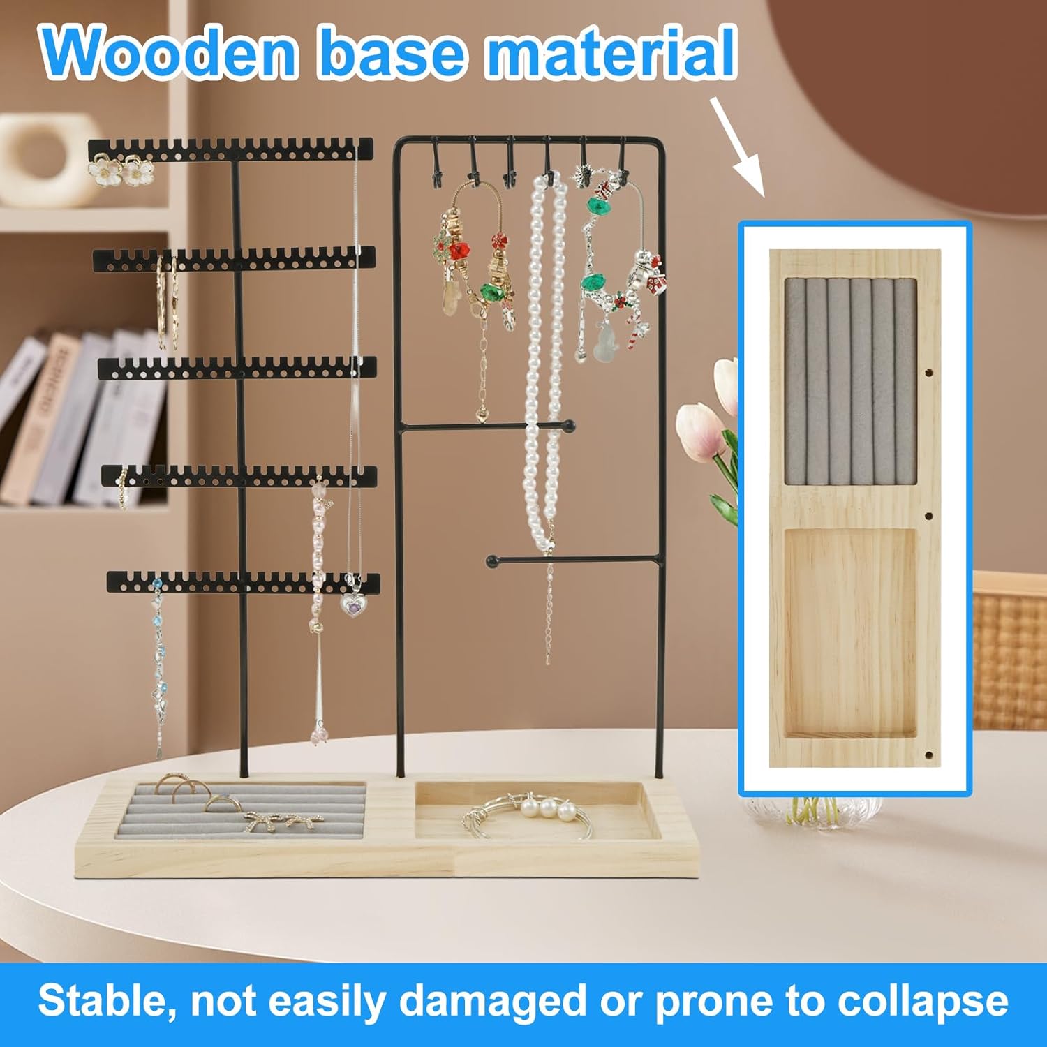 Stable Jewelry Organizer Stand: The base of the jewelry organizer stand is crafted from wood material, stable and enduring. It is not easy to be bad and not easy to fall, so you can use it with confidence