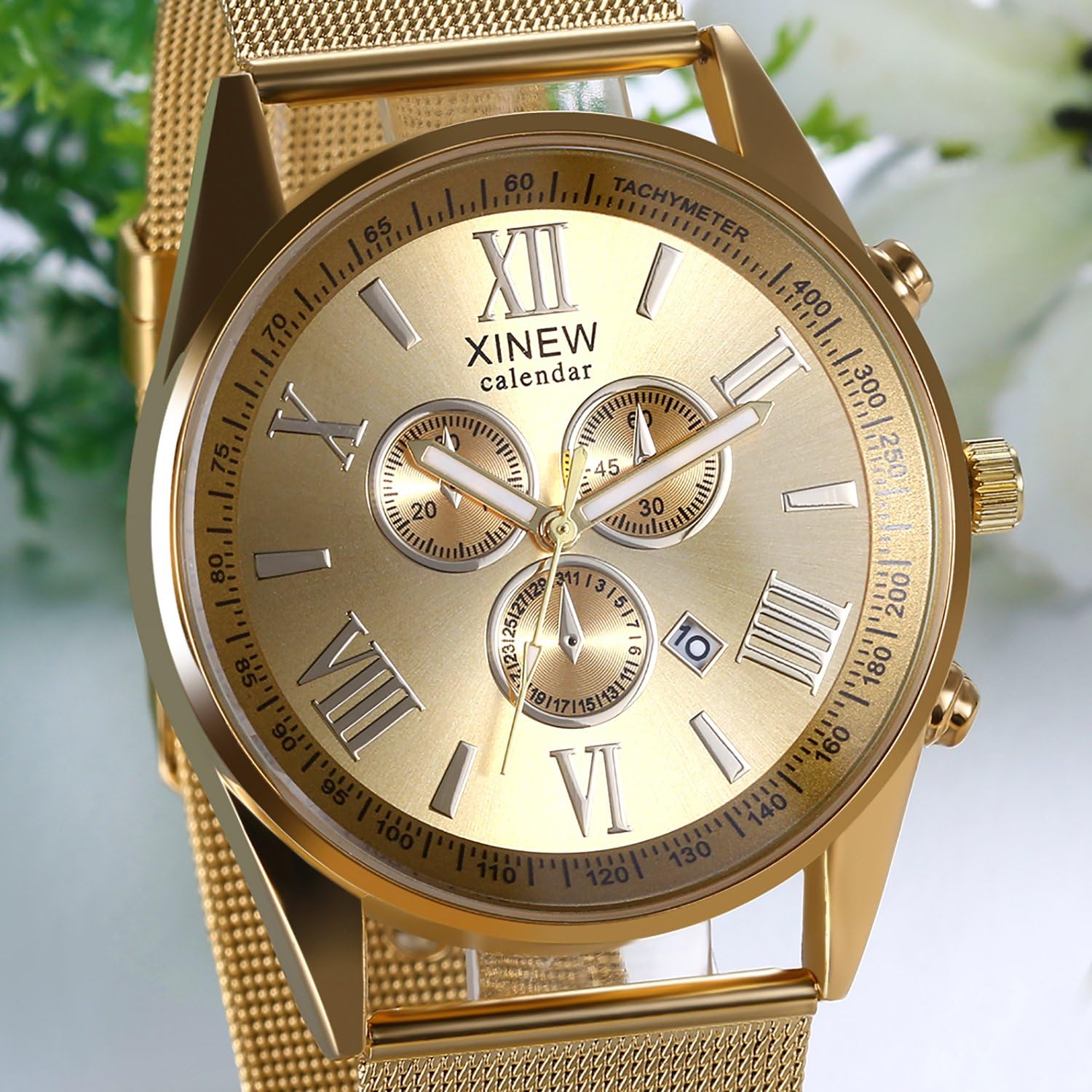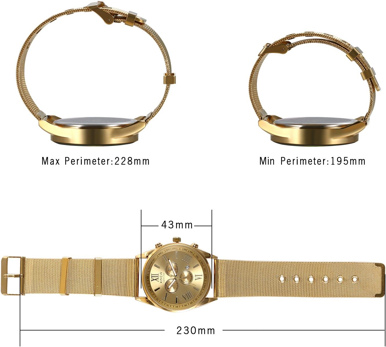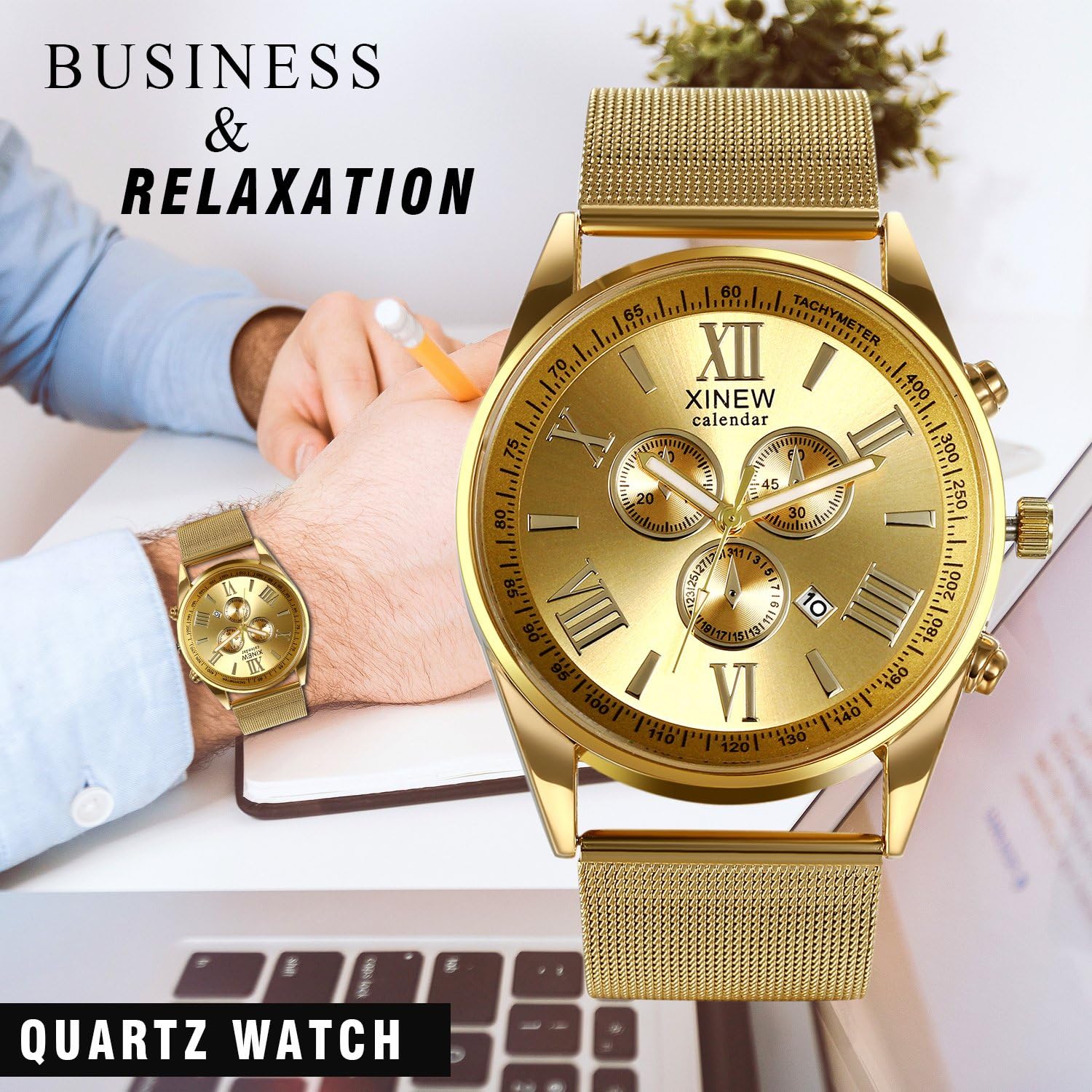 JewelryWe Luxury Men’s 3 Eyes Calendar Watch Stainless Steel Mesh Band Quartz Wrist Watches for Xmas Christmas Gold Black Silver for Christmas