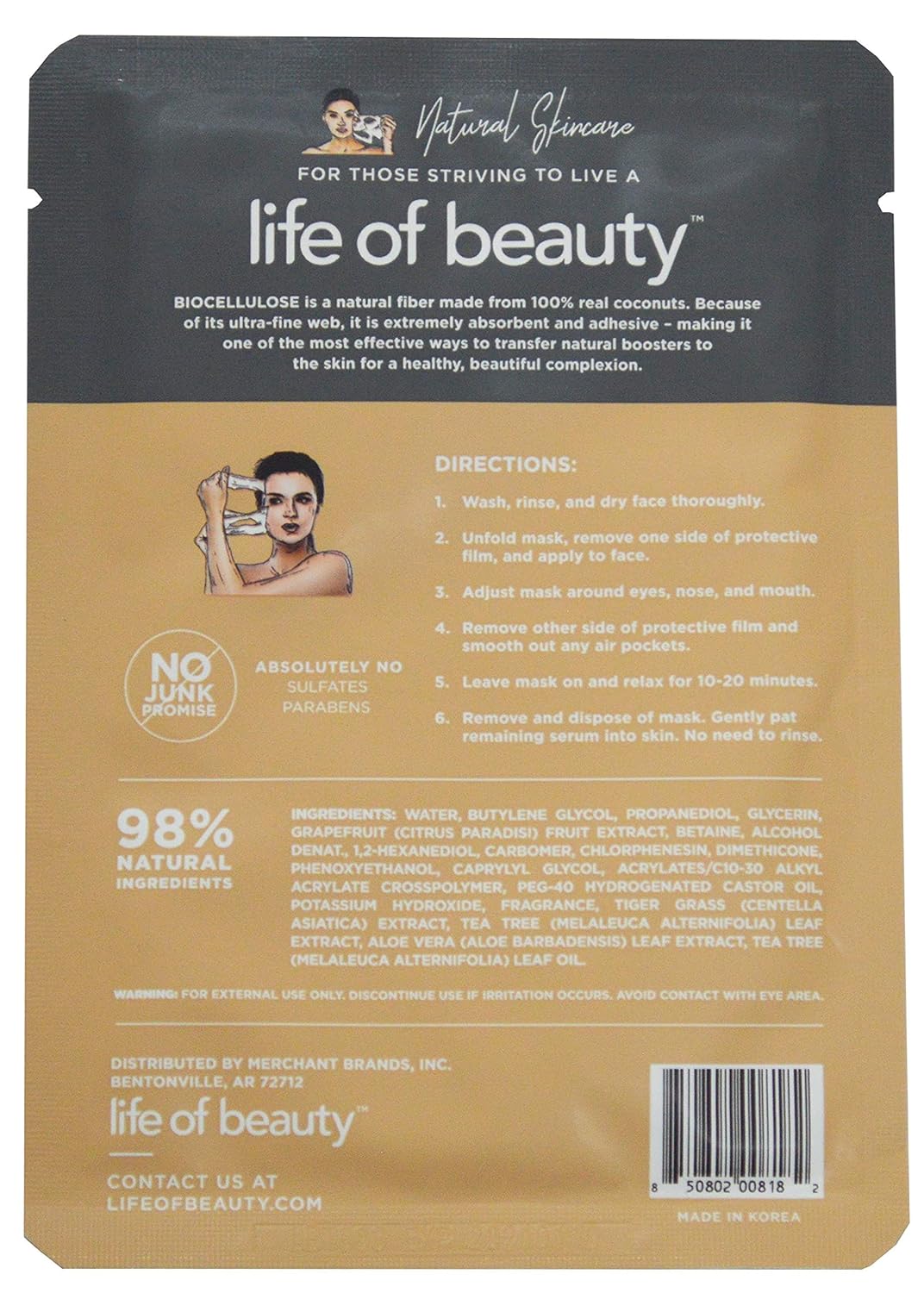 Every Life of Beauty Biocellulose mask helps reduce the signs of aging through natural ingredients that tighten the skin and give it a firm youthful appearance.