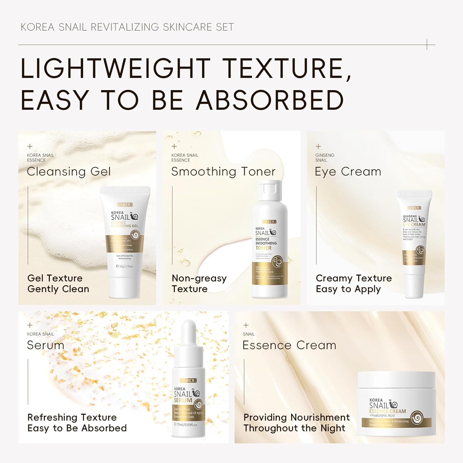 【Moisturizing & Nourishing】Our snail serum has the effects of shrinking pores, balancing the skin secretion of water and oil, rejuvenating skin and Repairing Skin.Our collagen face care set can help the skin resist oxidation and Reduce Fine Lines.