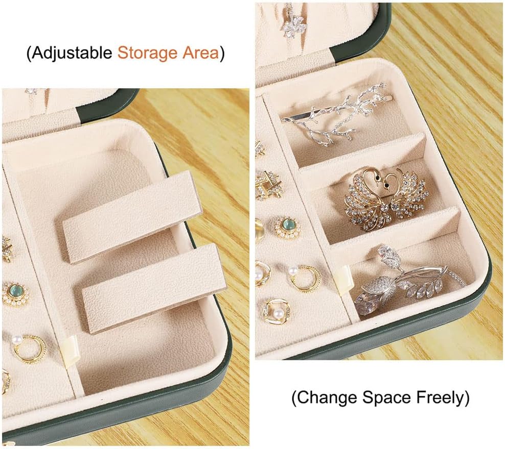CLASSIFY AND ORGANIZE JEWELRY – Jewelry box is small in size and large in capacity, 8.26″(L) x 5.5″(W) x 1.7″(H).7 necklace hooks and 1 organizer pouch (to prevent necklaces from getting tangled in the top compartment), 7 ring compartments for multiple rings, 1 earring card, hidden compartment underneath for bracelets, bangles, etc., and 3 small compartments on the right side with removable dividers for all kinds of Jewelry.