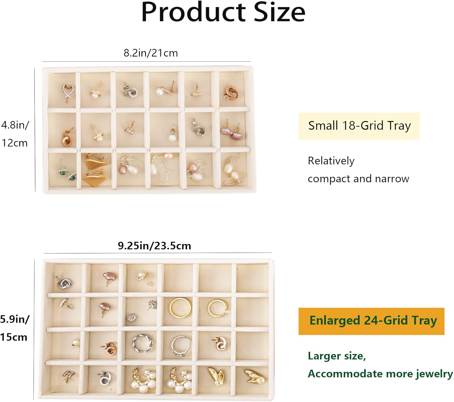 【4pcs Velvet Jewelry Trays】Each jewelry drawer organizer set includes 24-Grid Tray, Earring Tray, Ring Tray,Bracelet Tray for storing jewelry. Size: about 23.5*15*2.5cm/9.25″x5.91″x1″.Please keep an eye on the size before purchasing, so as to avoid the gap between the actual size and your imagination!