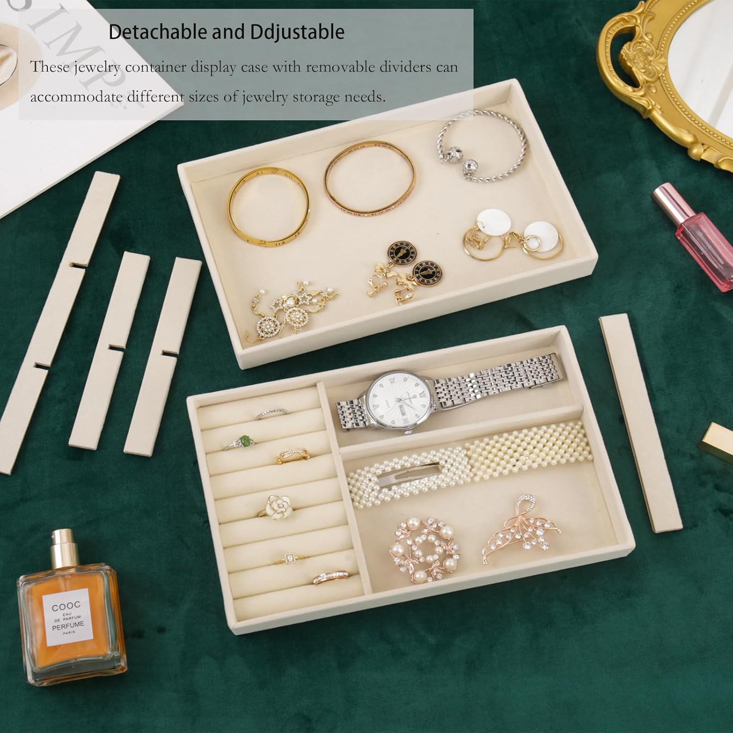 【Detachable and Ddjustable】These jewelry container display case can store your rings, necklaces, studs, earrings, bracelets and with removable dividers, can accommodate different sizes of jewelry storage needs.