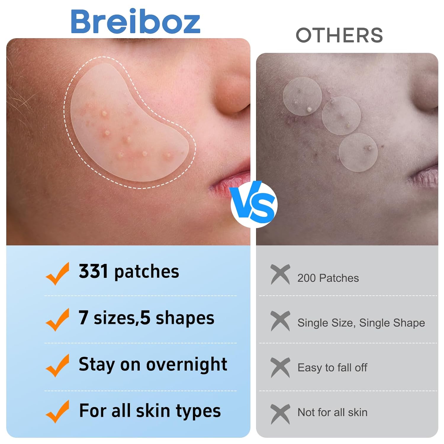 🌿【331 Patches, 7 Sizes,5 Shapes】Acne patches are specially designed for 24hr acne care. Our acne patches for face, chin, forehead, body, back, neck & chest etc. Our skin care zit patches in varied size and shapes to meet your needs. Our pimple patches large allow you to wear them confidently day or night while still letting their magic work.Select a bigger size hydrocolloid patch than the spot, stick the zit patches on the acne before sleeping, and wake up to cleaner skin