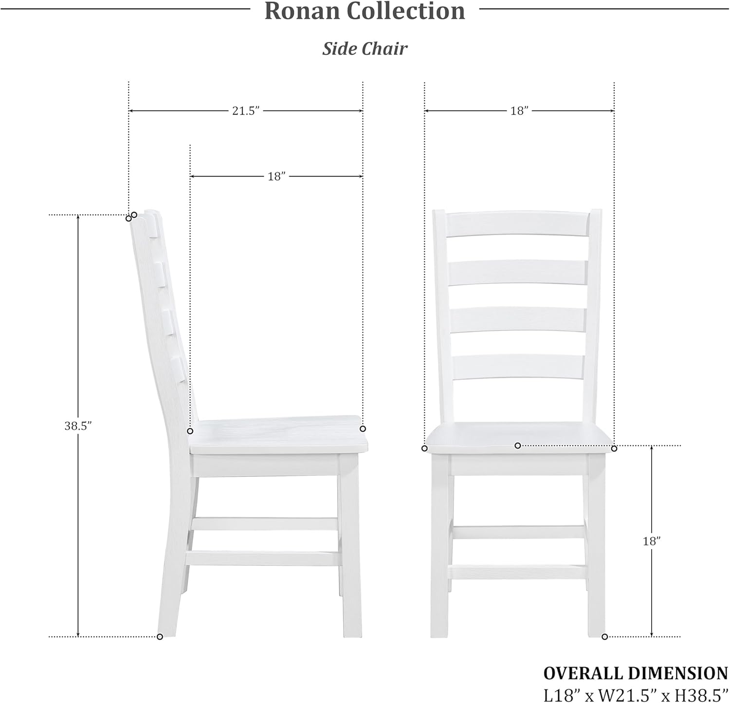 [Dimensions] The dining room chair measures: L18” x D21.5” x H38.5”, Seat Height: 18”, Seat Dimension: 18” x 18”, Weight Capacity: 250lbs. Featuring a specially designed surface and footrest, our chairs also provide optimal lumbar support, ensuring all-day comfort for extended periods of sitting
