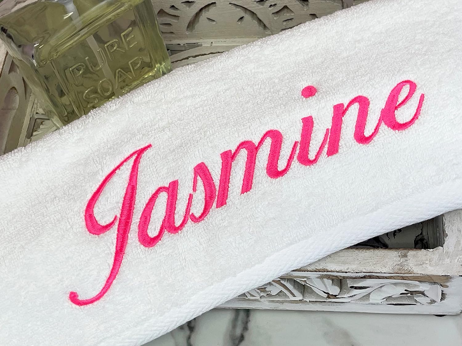 WHITE TOWELS CAN BE BLEACHED AND WON’T AFFECT THE EMBROIDERY. Custom Products are not returnable. Set of Four towels. Custom embroider a name in your choice of multiple thread colors and font options creating a must-have bath piece for any home. These wash cloth towels allow you to have your own body and face towels for your use only, also adding a design touch to your bathroom and skincare routine.