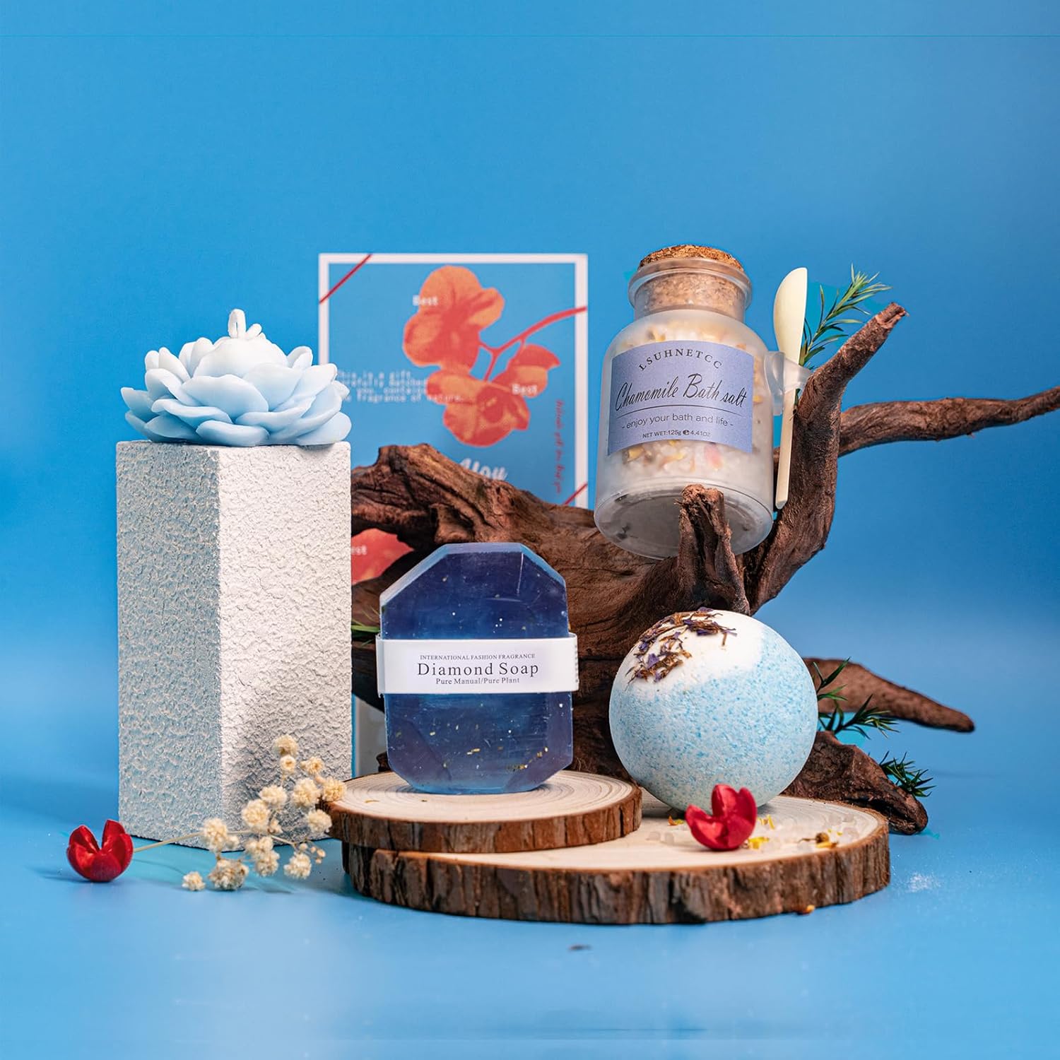 Bath Salt Bath Balls:Imagine a stunning gift box containing a spa set that includes rose bath salts, bubble bath bombs, and gem-shaped soaps, along with a soft towel shaped like a teddy bear and a card with warm wishes. This heartfelt gift for women is truly unique! Send this spa gift for sister, mom, best friends to let her enjoy a cozy and leisurely time.