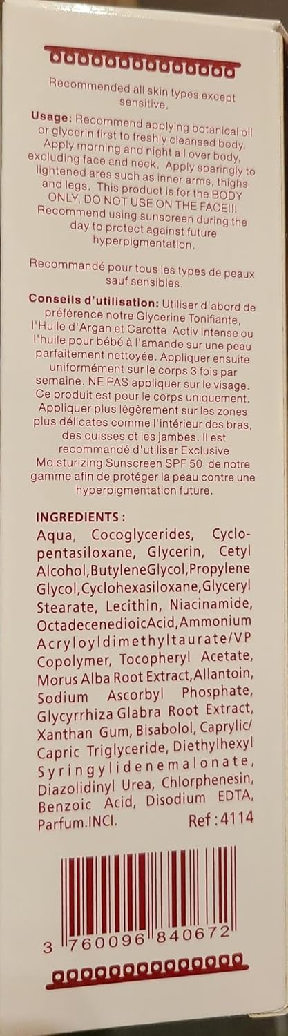 GREAT FOR DIFFERENT SKIN TYPES: Our skin brightening lotion is recommended for all skin types except sensitive skin. You can apply it all over your body except on the neck and face.