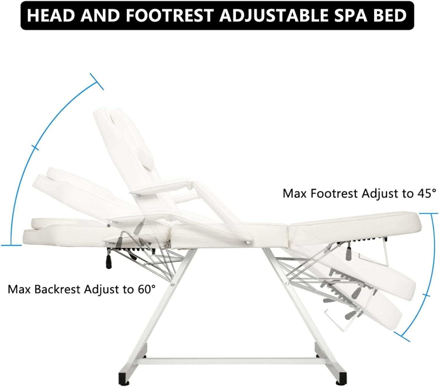 Material: Steel Frame/PVC Leather/SpongeColor: WhiteBed Adjustable: Backrest 0° – 65° incline upward & Footrest 0° – 70° downward declineStool Height Adjustment: 18″ – 24.5″Bed Dimensions: 72.8″(L) x24.4″(W) x 27.6″(H)Stool Dimensions: 19″(L) x 19″(W) x (18-24.5)”(H)Weight Capacity: 330lbs/150kgBed Weight: 49.6lbStool Weight: 7.72lb