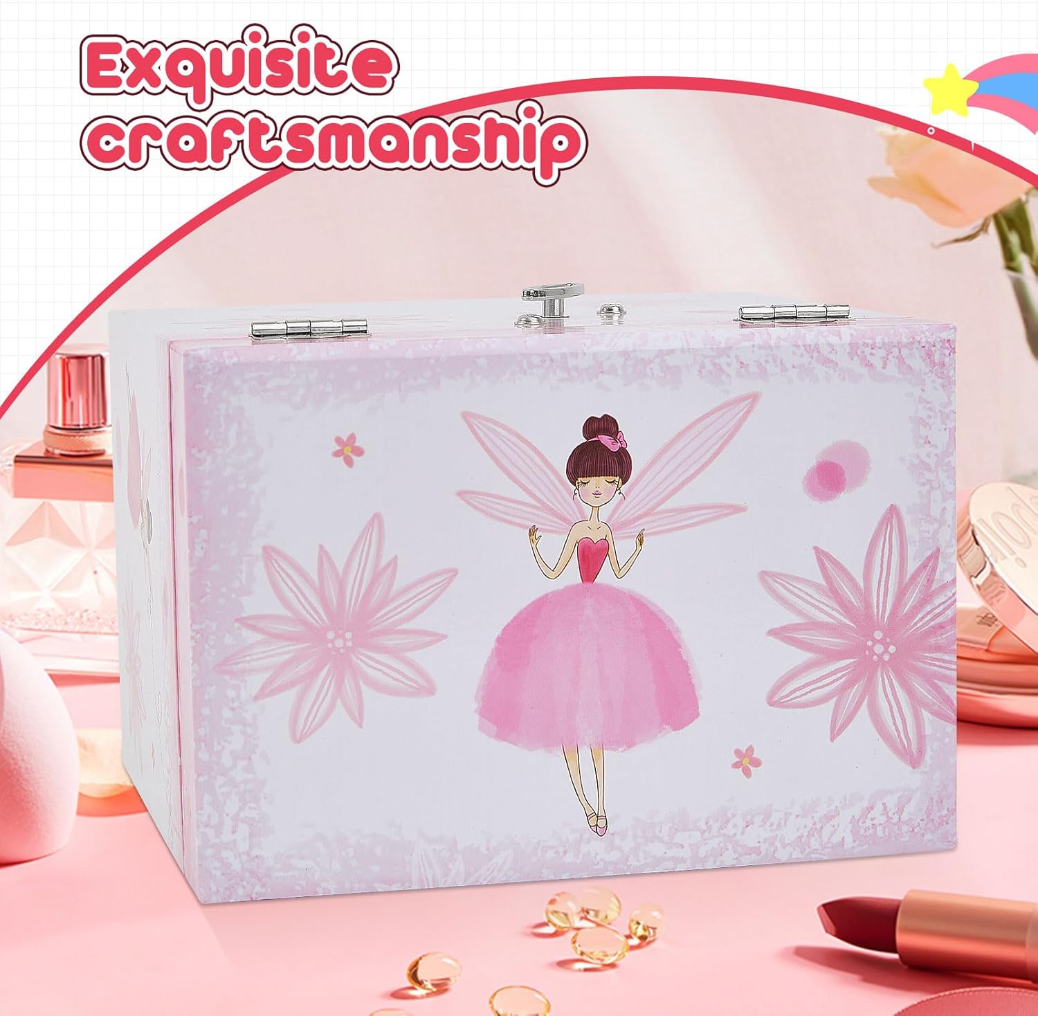 【Spinning Ballerina】: The musical jewelry box has a cute spinning fairy design, with a beautiful fairy image on the front. When you open the lid, the fairy will rotate automatically, and the music will play. The fairy is not only a beautiful decoration, but also a fun interactive toy.