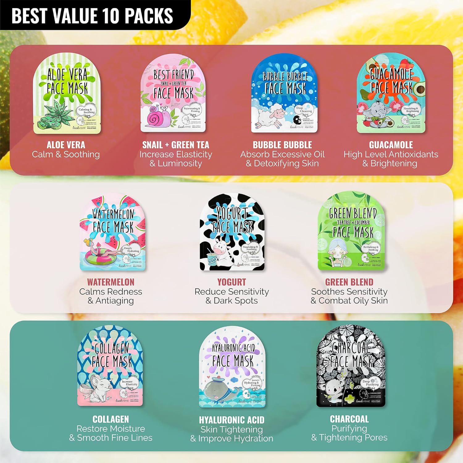 PREMIUM TENCEL KOREAN FACE MASK : This Look At Me Korean facial mask is made with premium grade tencel face sheet mask that is ultra soft, super comfortable and feels luxurious to the skin. Comes with 10 variety packs, suitable for all skin types, even for sensitive skin.
