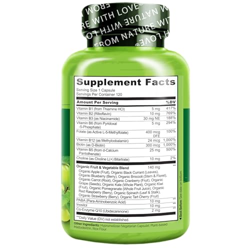 Specification: NATURELO Vitamin B Complex with Methyl B12, Methyl Folate, Vitamin B6, Biotin Plus Choline, CoQ10, and Fruit & Vegetable Blend – Supports Energy & Healthy Stress Response – Vegan – 120 Capsules