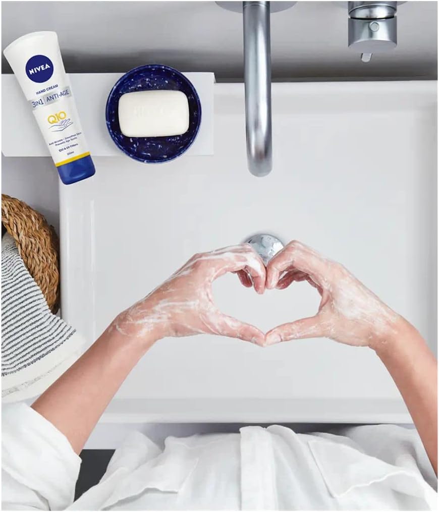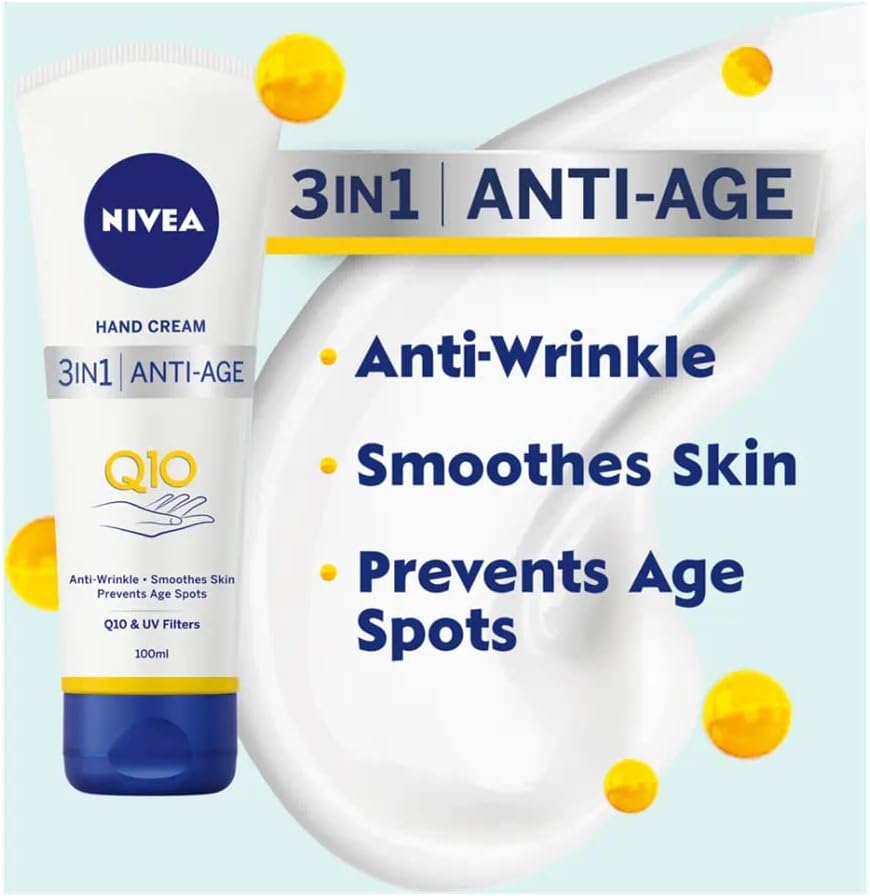 NIVEA Anti-Age Care Hand Cream with Q10 and UV filters visibly reduces the first signs of aging with regular use.