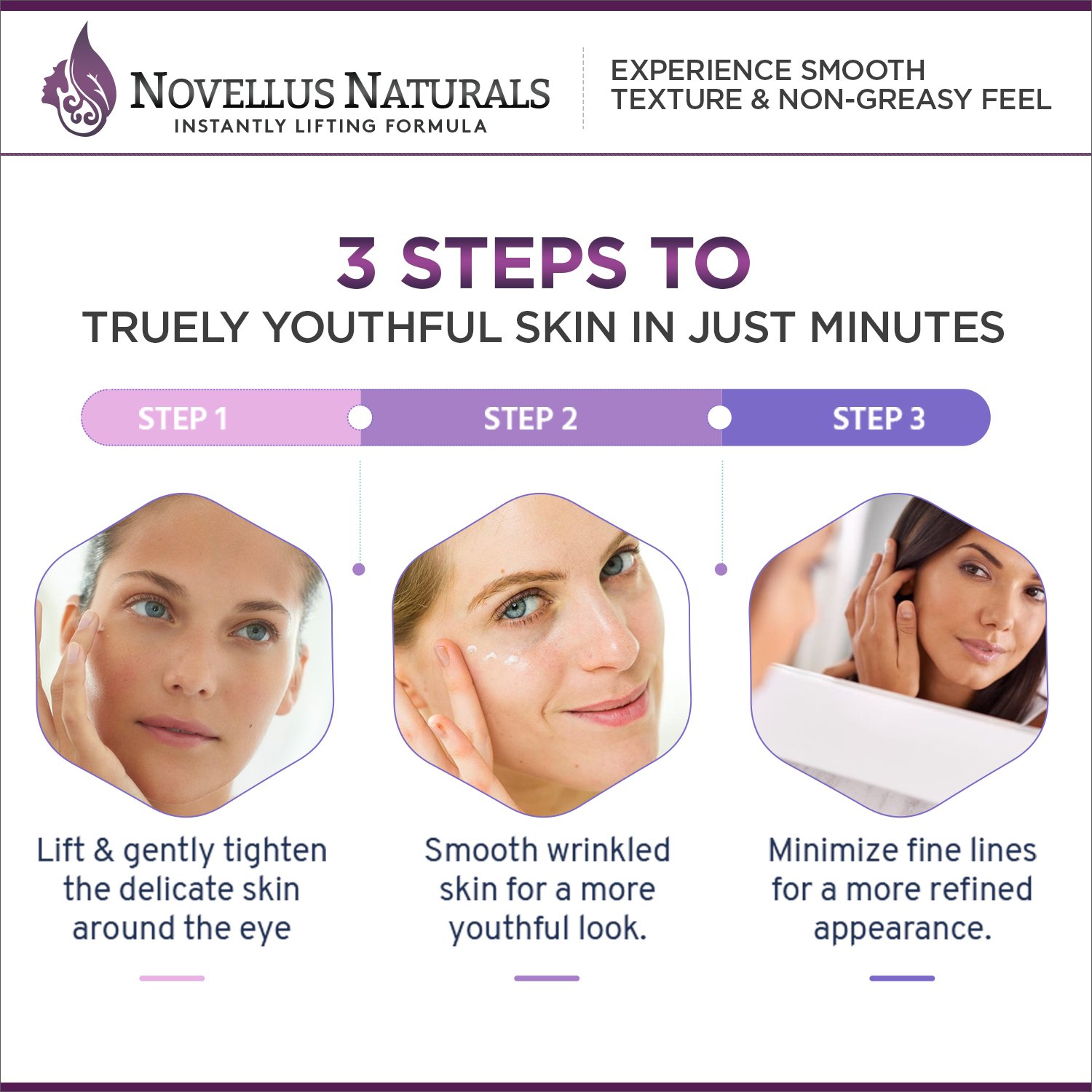 You will love your skin from morning to night when you see what Novellus Naturals Instant Lift can do for your skin. Experience smooth texture and non-greasy feel as you apply it to your face.