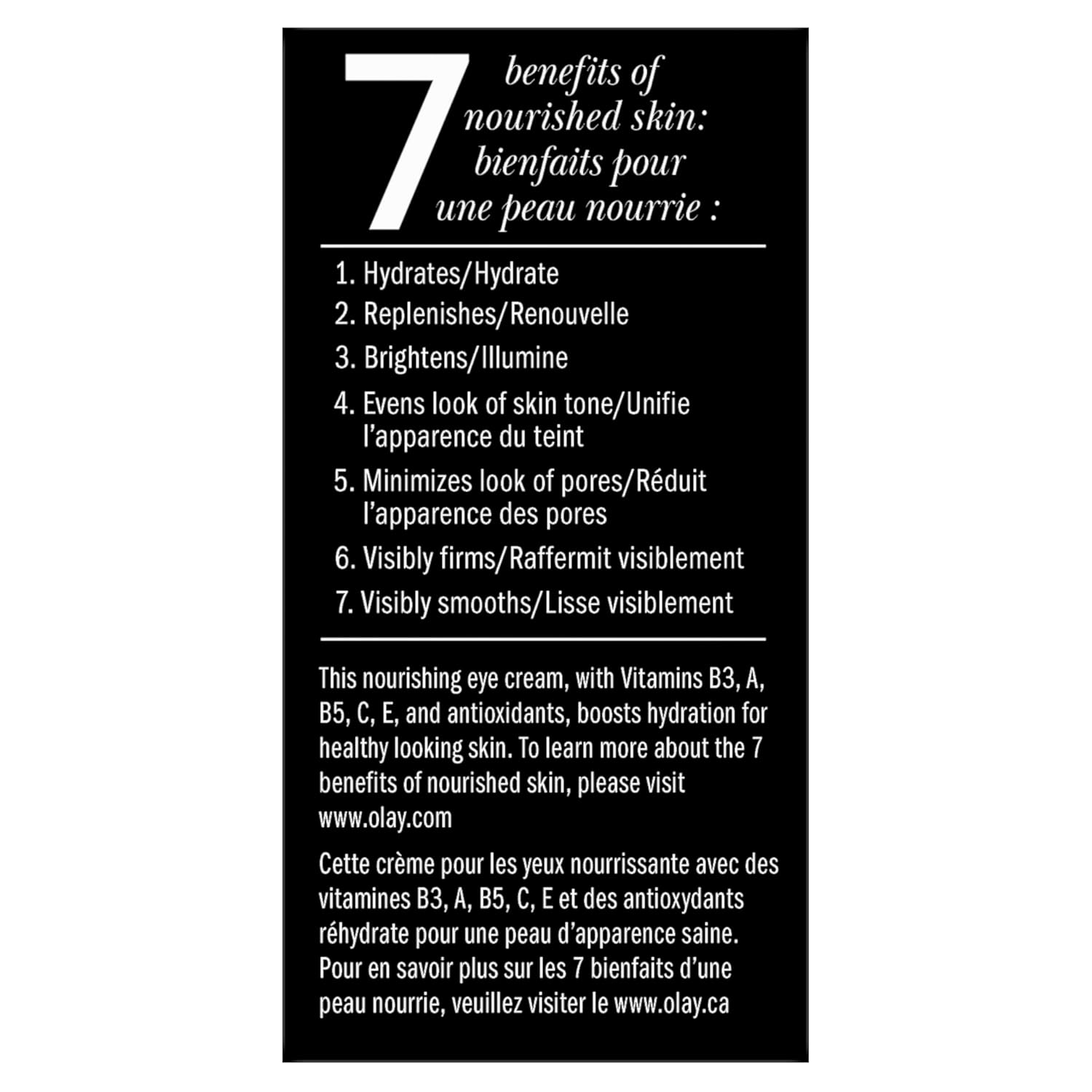 Total Effects 7-in-one Anti-Aging Eye Transforming Cream is a daily, all-in-one eye treatment, formulated with a vitamin-rich complex to Fight 7 Signs of Aging Around the Eyes: Replenishes moisture, Visibly smoothes fine lines and wrinkles, Instantly reduces appearance of dark circles, Instantly enhances brightness around the eyes, Massage to reduce the look of puffiness, Instantly evens skin tone appearance, smoothes and evens skin texture. Olay recommends that Total Effects Anti-Aging Eye Cream is used after your cleansing routine to treat the eye area and then follow with face moisturizer application.