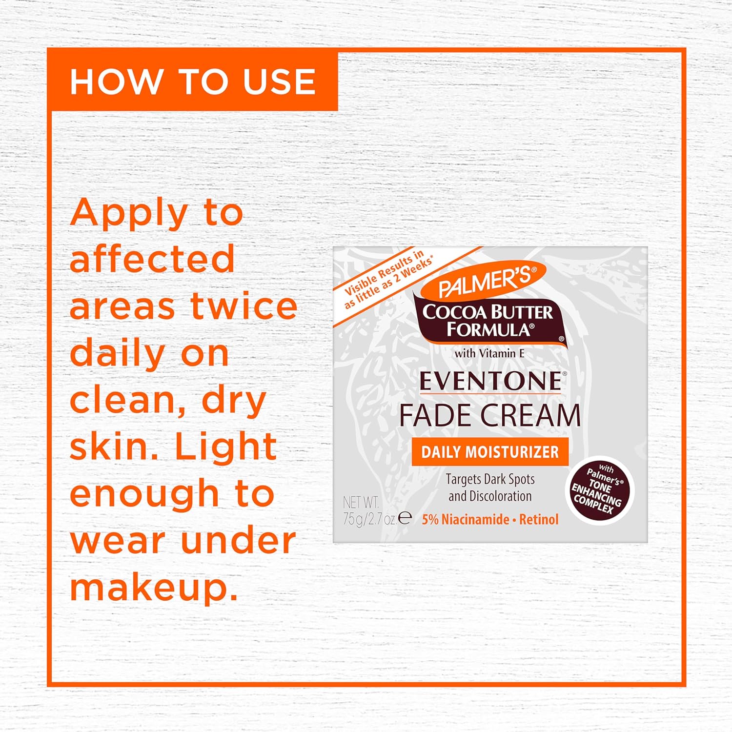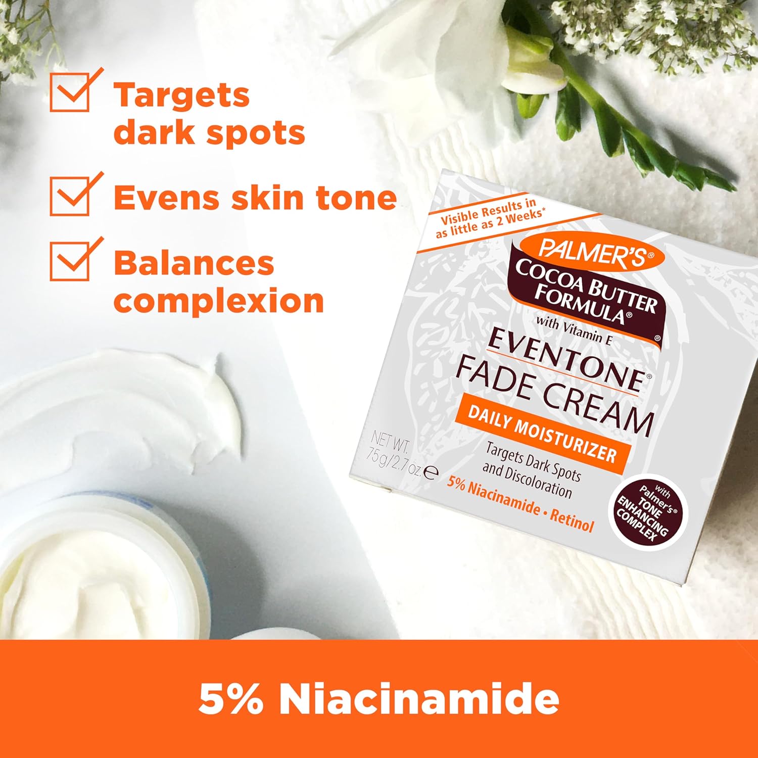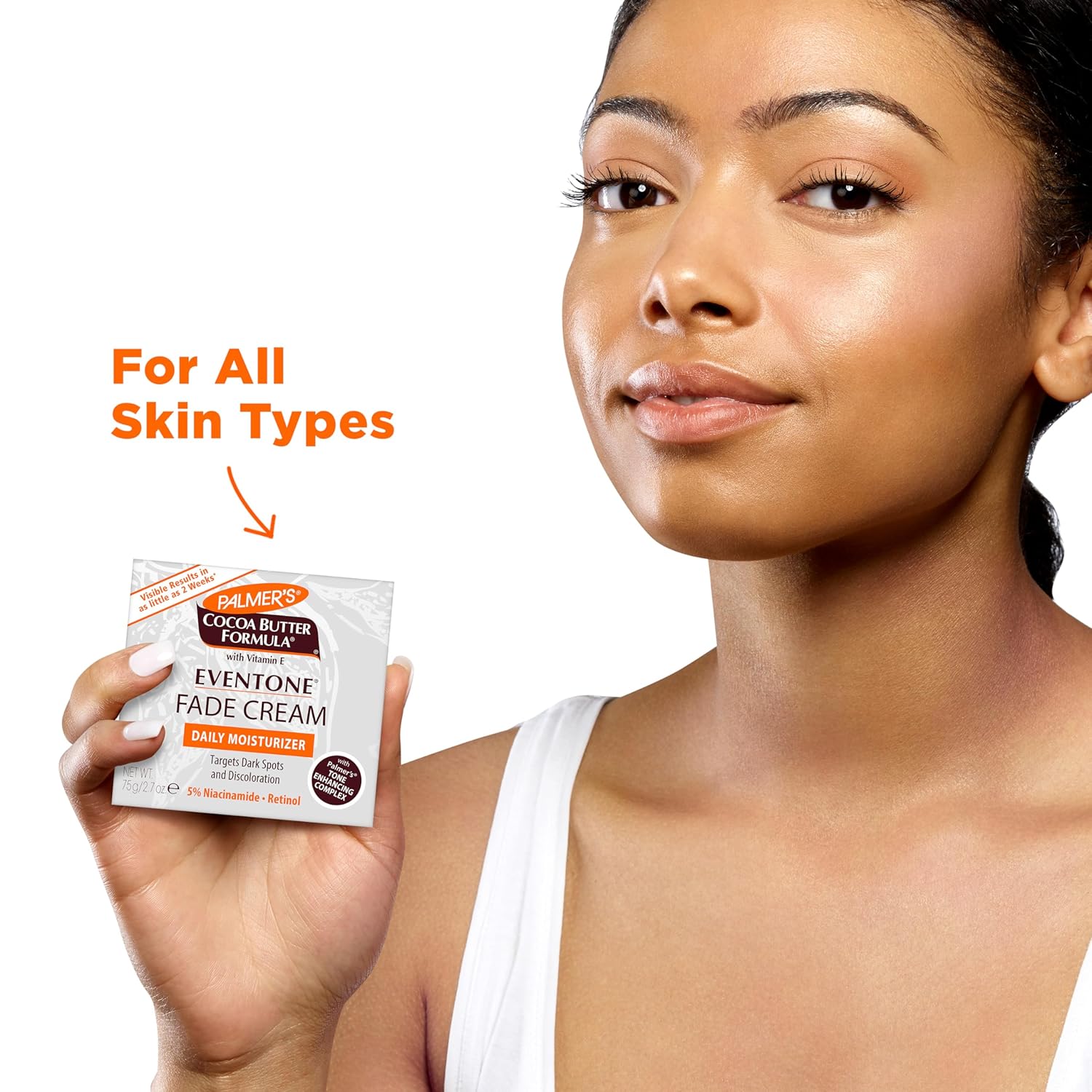 Battling skin discoloration? When you’re dealing with dark spots, diminishing them may not happen overnight, but consistency is key. Applying a fade cream when you start your day, or before you climb into bed, could be an asset to your facial skin care routine. Palmer’s Cocoa Butter Formula Eventone Fade Cream visibly targets unwanted discoloration, dark spots or age spots caused by sun damage, aging skin or scarring. Free of Hydroquinone, Parabens, Phthalates, Fragrance Sulfates, MI and Dyes, this fade cream for dark spots is made with 5% Niacinamide to leave your skin brighter and more radiant looking.
