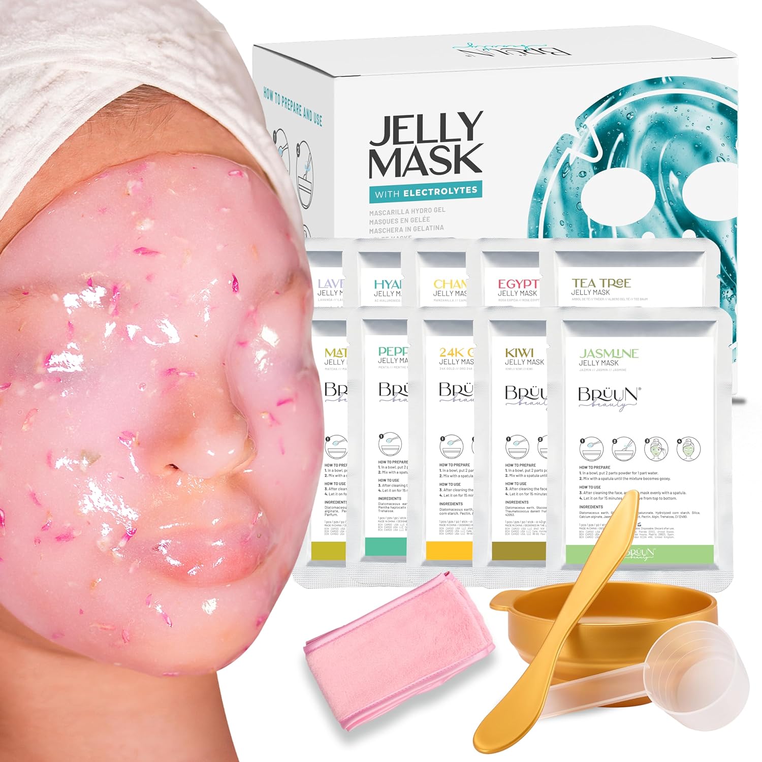 Peel-Off Jelly Mask Premium Modeling “Rubber Mask” Spa Set – 10 Treatments (24k Gold, Lavender, Kiwi, Peppermint, Egyptian Rose, Matcha, Chamomile, Tea tree, Jazmine)