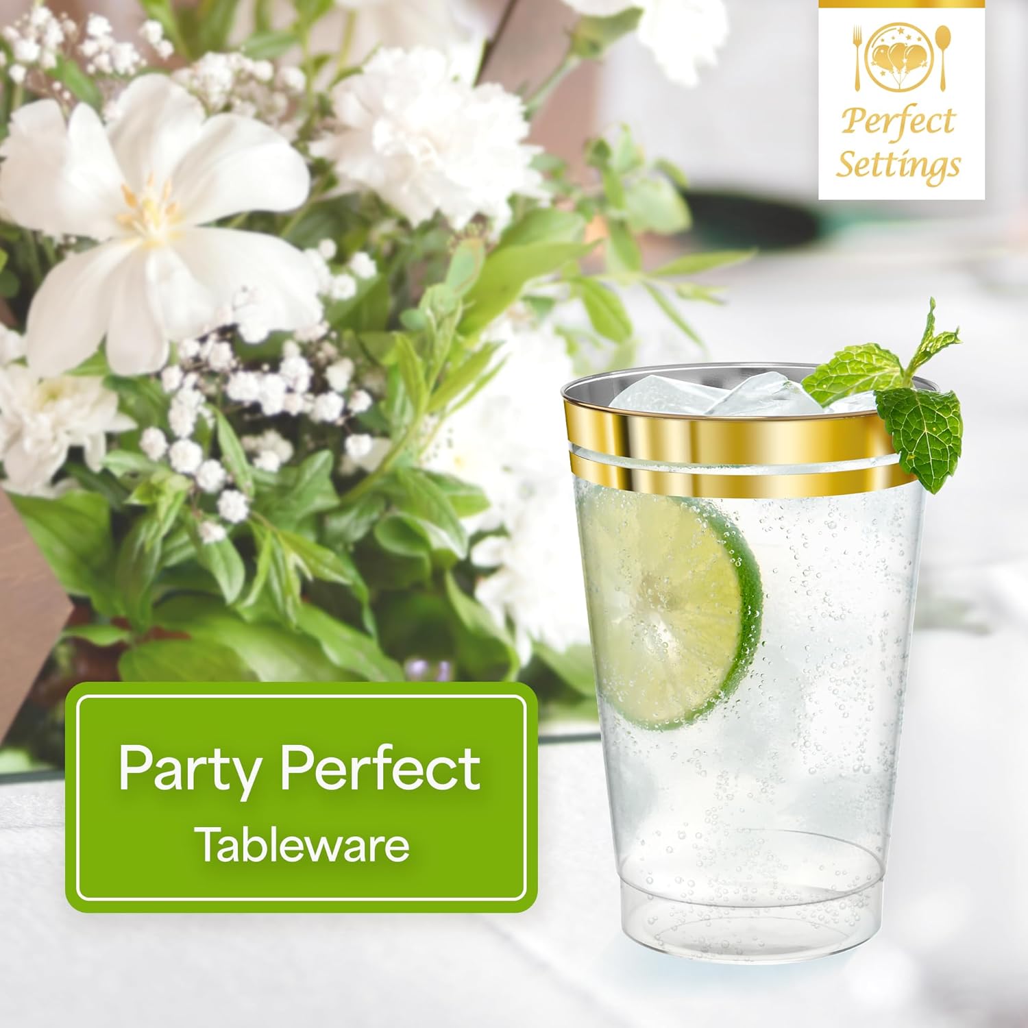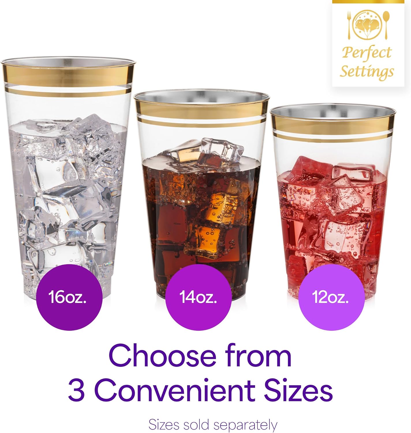 Perfect Settings Clear Disposable Plastic Cups with Gold Rim – Elevate your party into a sparkling event with these double gold rimmed, clear plastic 16 oz. cups which easily hold a standard can of soda or beer, wine, water, drink or cocktail.