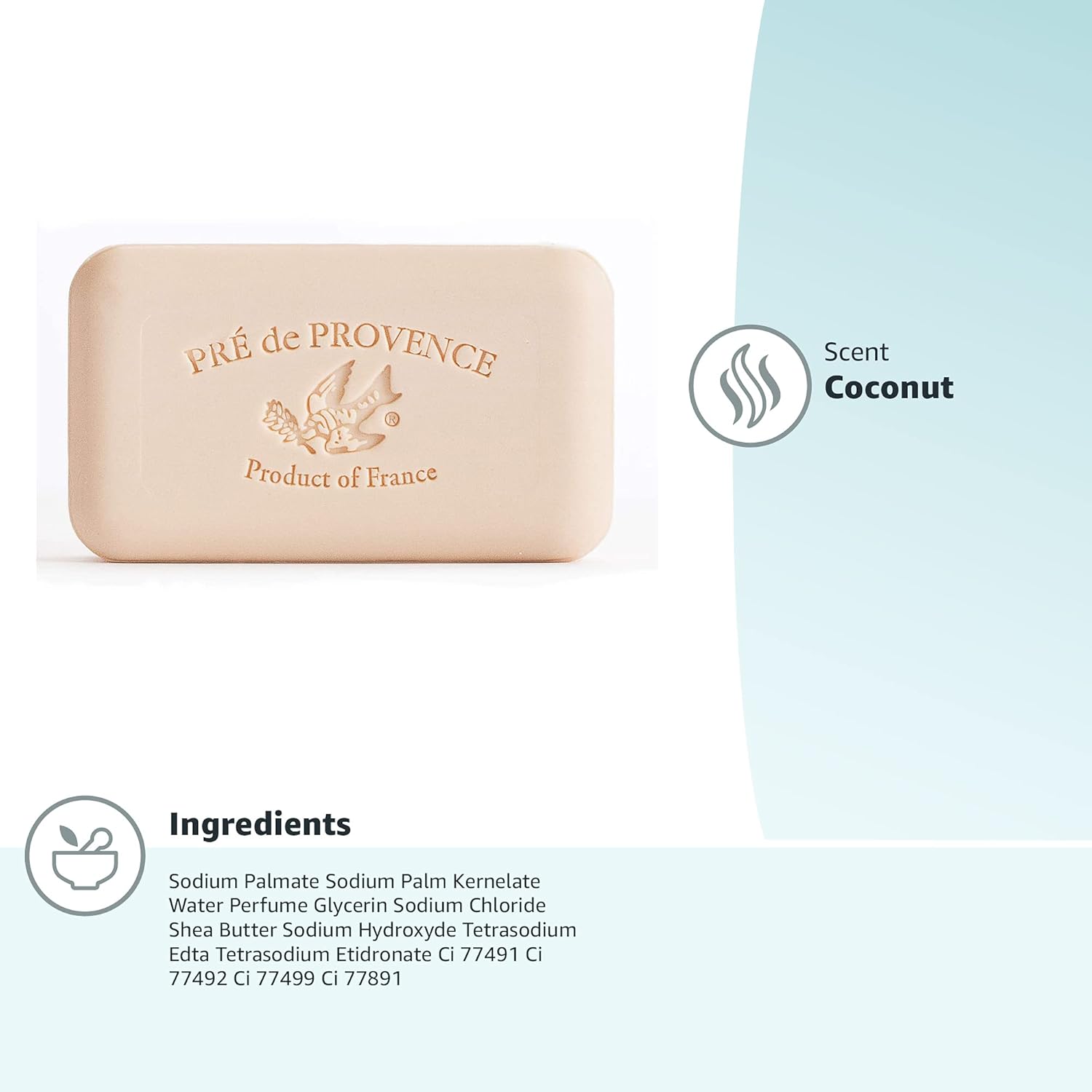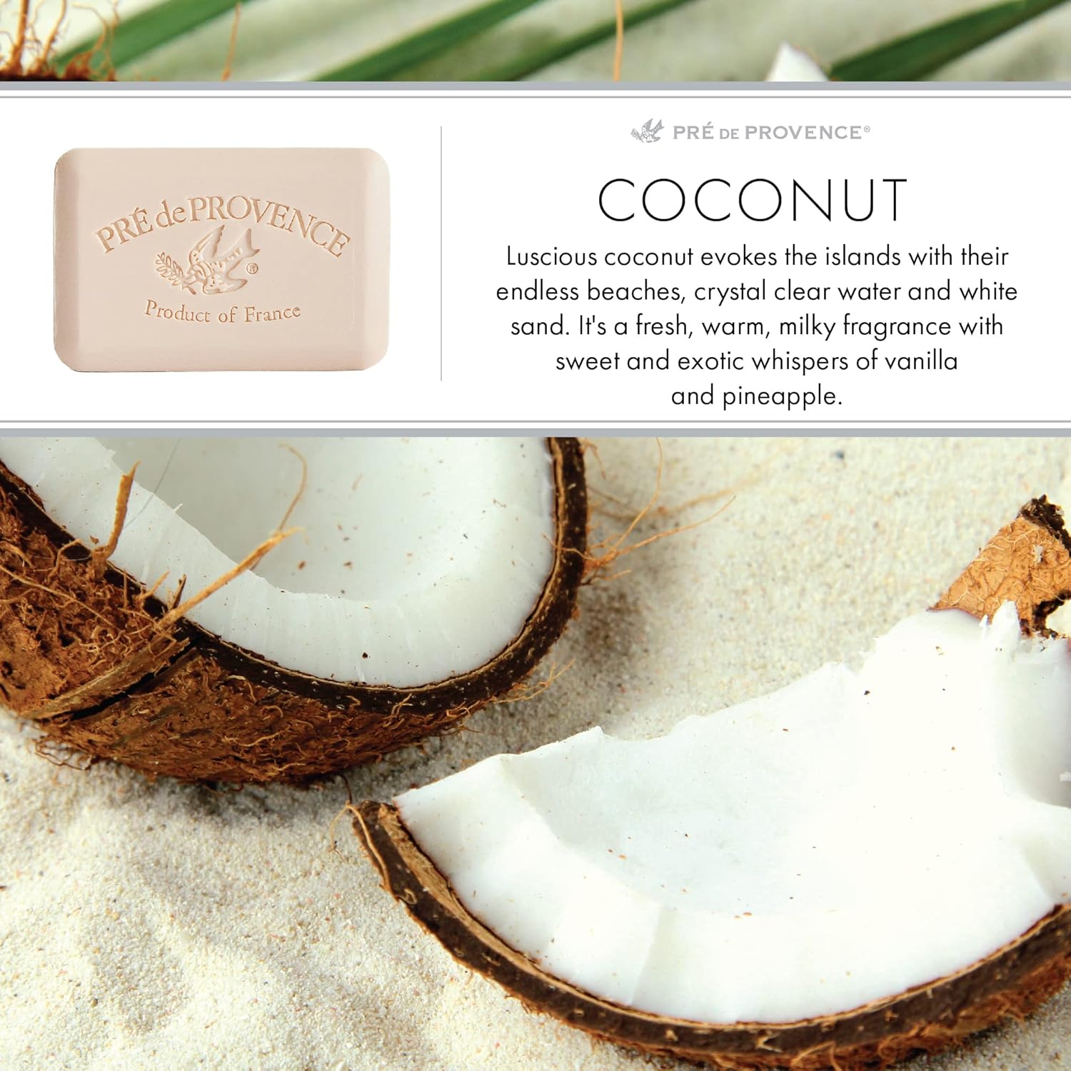 Pre de Provence Artisanal Soap Bar, Natural French Skincare, Enriched with Organic Shea Butter, Quad Milled for Rich, Smooth & Moisturizing Lather, Coconut, 5.3 Ounce