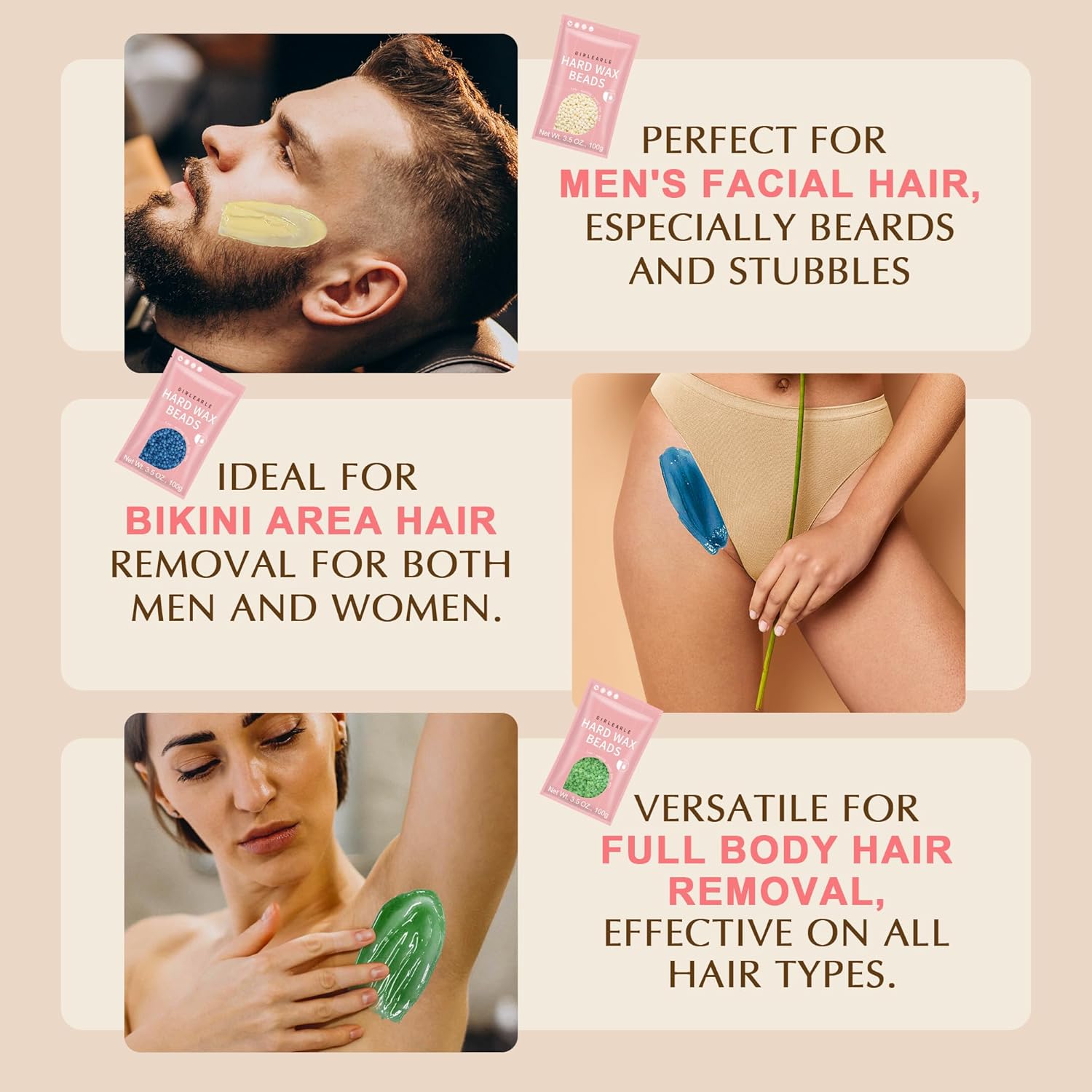 π§ππ₯πππ§ππ πͺππ« πππππ¦ ππ’π₯ ππππ₯ π₯ππ π’π©ππ: This waxing kit includes cream wax beads ideal for men’s facial hair, beard, and eyebrow, chamomile wax beads for the sensitive bikini area, and aloe vera for full-body use. Tailored for various skin types and hair removal areas, these wax beads provide a gentle yet efficient waxing experience. It’s suitable for all hair types, making this selection perfect for a body wax kit for hair removal and leg waxing kit for women.