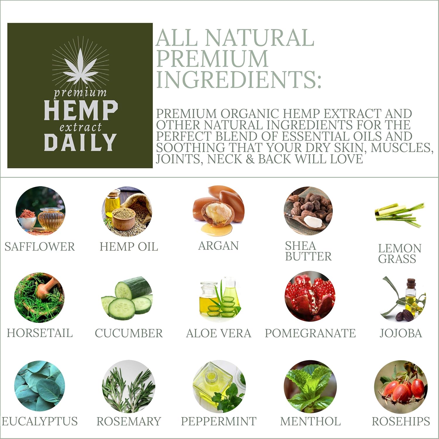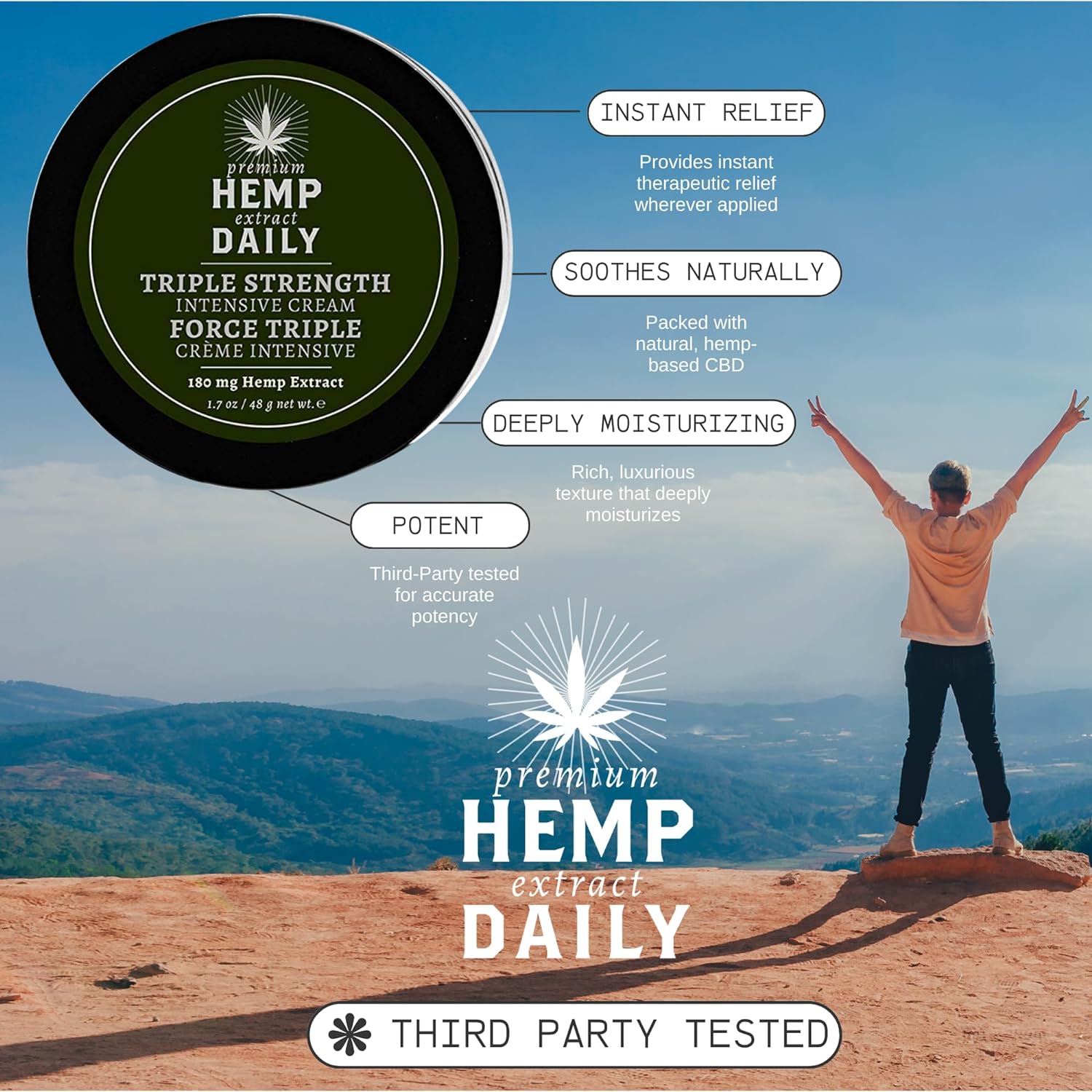 All-Natural Ingredients: Formulated in the USA with the highest quality natural ingredients, including Hemp Oil, Argan, Rosemary, Aloe Vera, and Eucalyptus. Non-GMO, Gluten-free, and cruelty-free. Third Party Tested.
