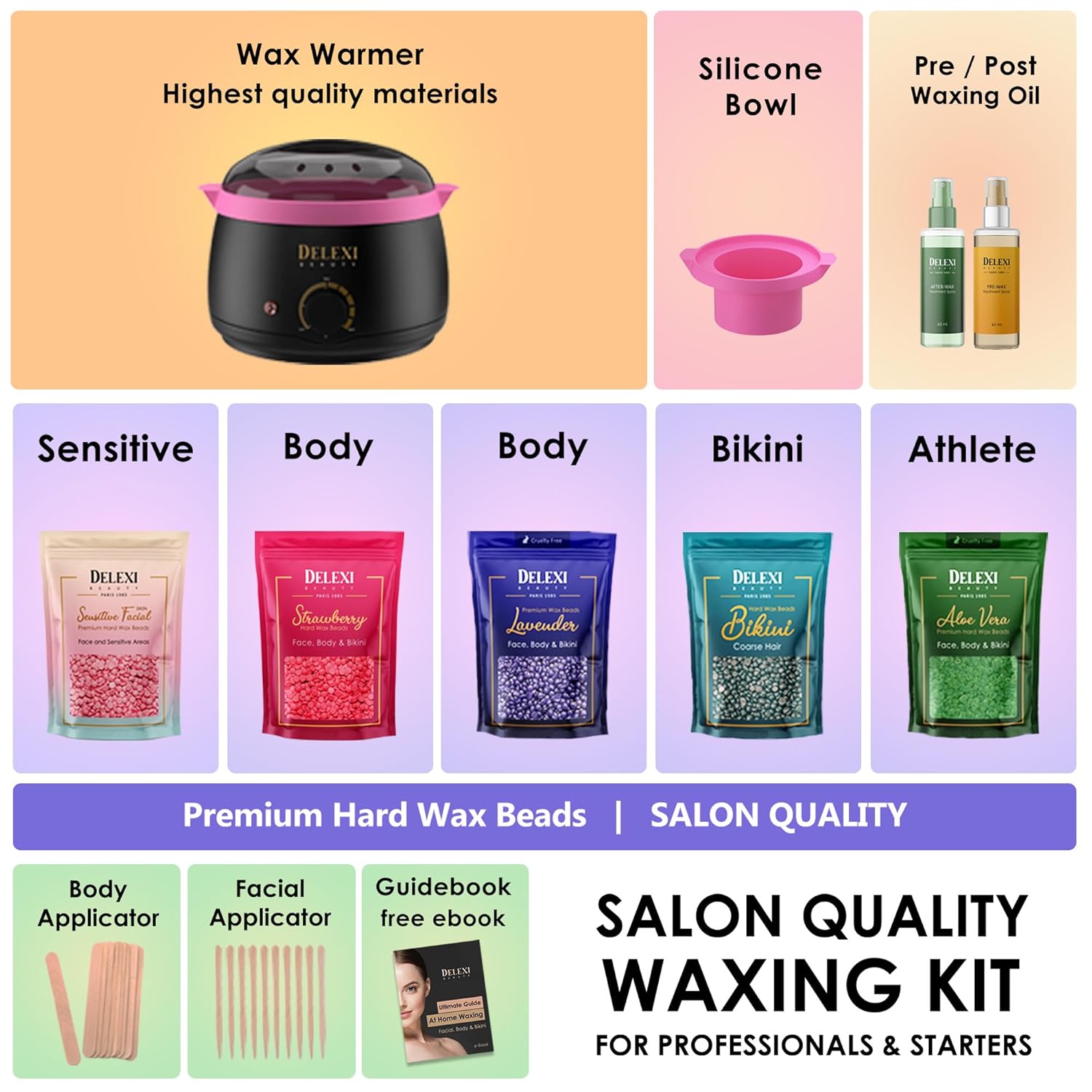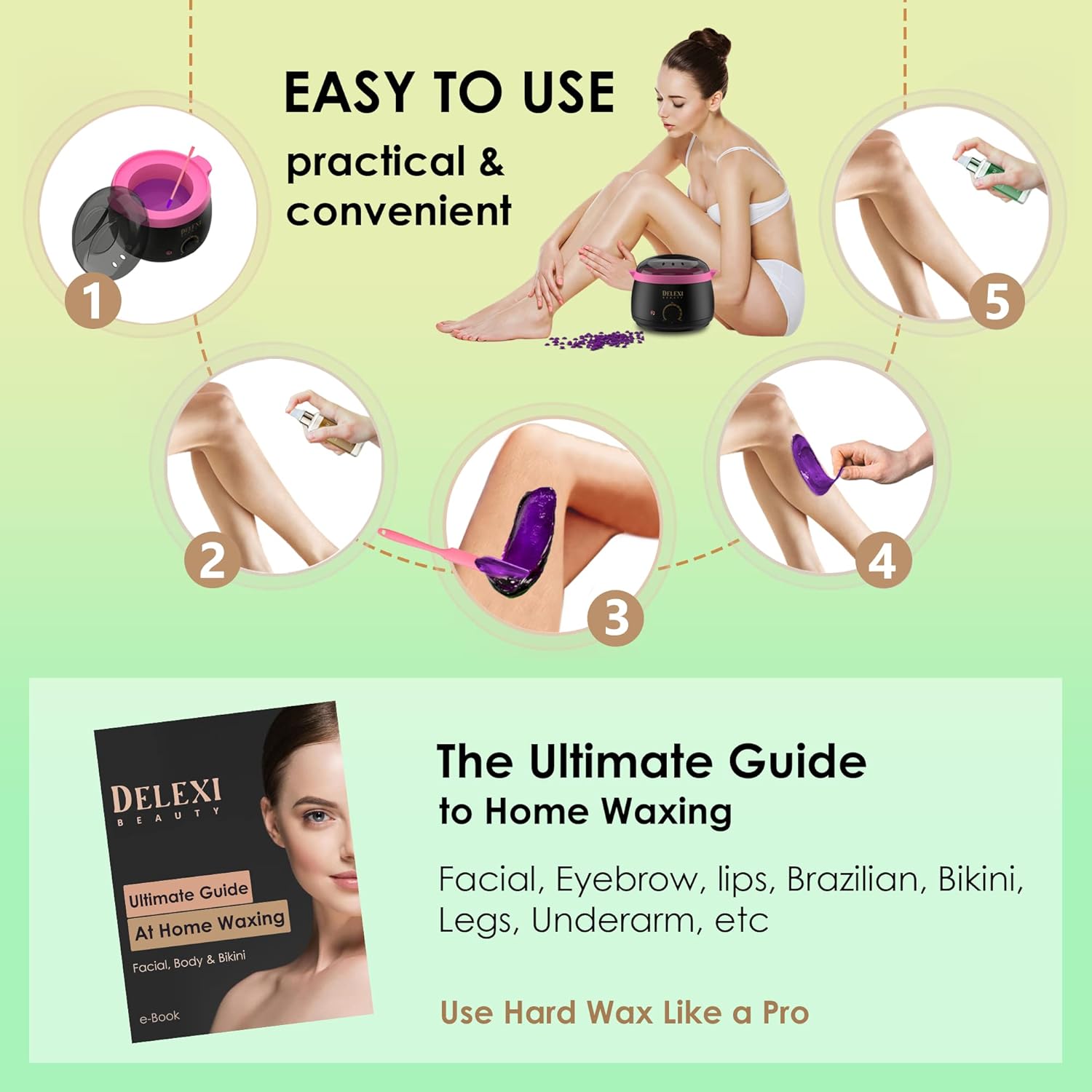 The DELEXI premium waxing kit makes hair waxing a fun, enjoyable experience with a long-lasting effect.