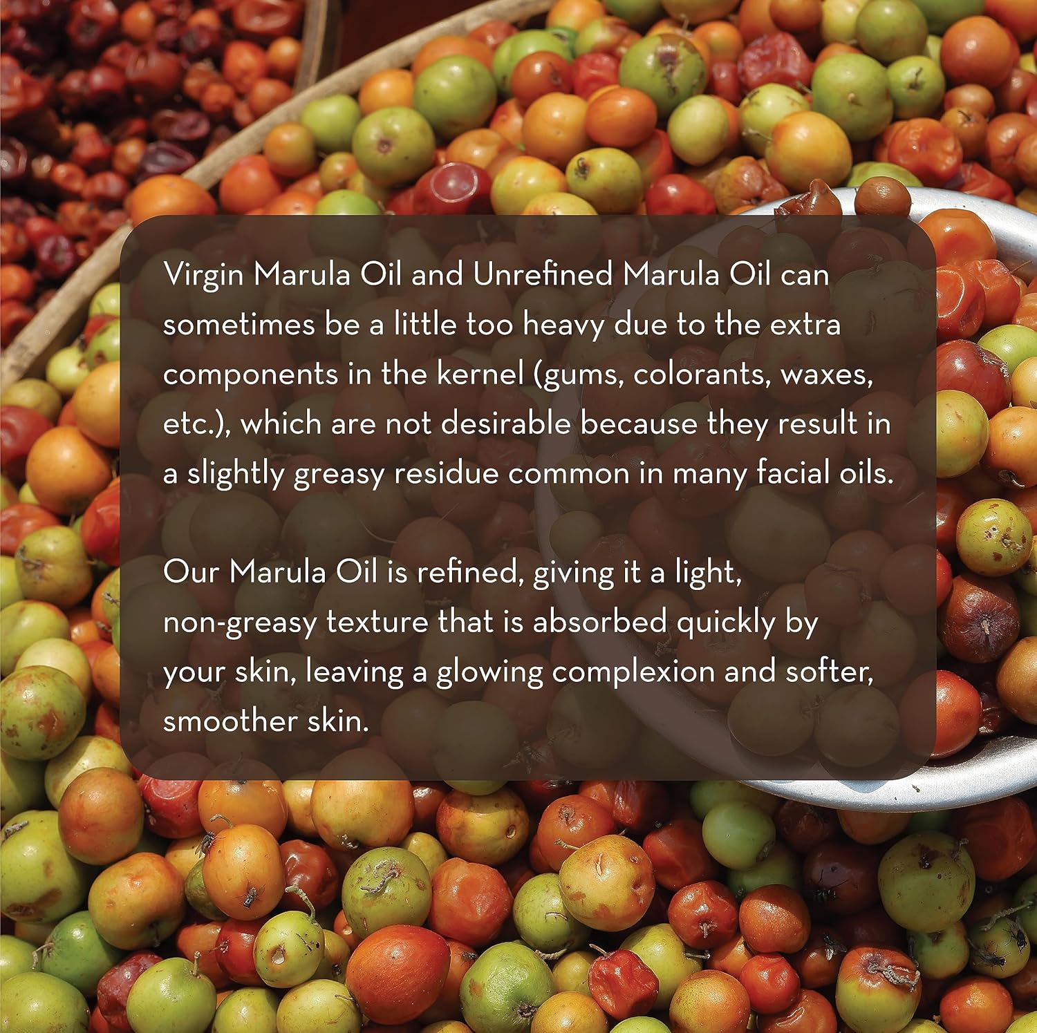 Our Marula Oil is wild harvested, cold-pressed, and refined. Virgin Marula Oil and Unrefined Marula Oil can be a little too heavy due to the extra components in the kernels (gums, colorants, waxes, etc.), which are not desirable because they result in a slightly greasy residue common in many facial oils. Our Marula Oil is refined, giving it a light, non-greasy texture that is absorbed quickly by your skin.