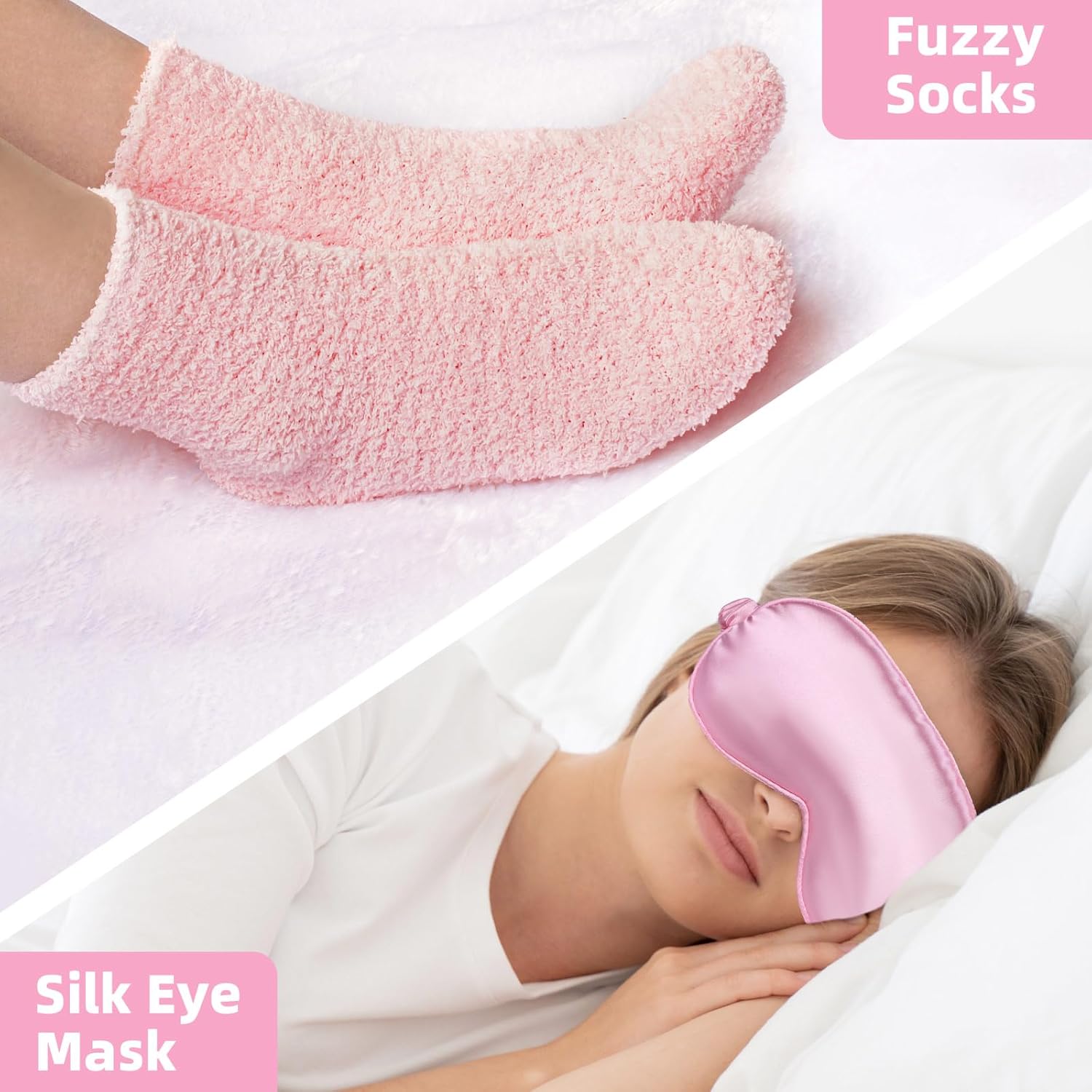 Pamper Her with a Touch of Luxury: Our self care spa gift set pampers her from head to toe with a premium silk eye mask for restful sleep, luscious bath salts for a fragrant soak, a captivating diamond bar soap, soothing bath bomb, a scented candle for ambiance, and fuzzy socks for comfort. It’s an all-encompassing luxury experience.