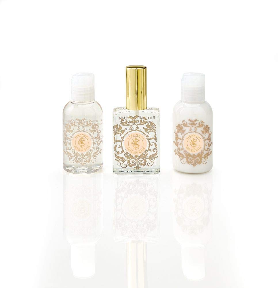 Shelley Kyle Tiramani Mini Gift Set: Our version of the perfect gift. Travel size,1 oz Parfum, 2 oz Amenity Lotion, and 2 oz Amenity Shower Gel. Packaged in a beautiful cream and gold gift box with ribbon.