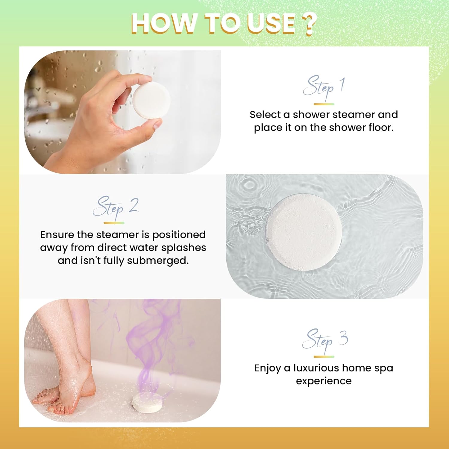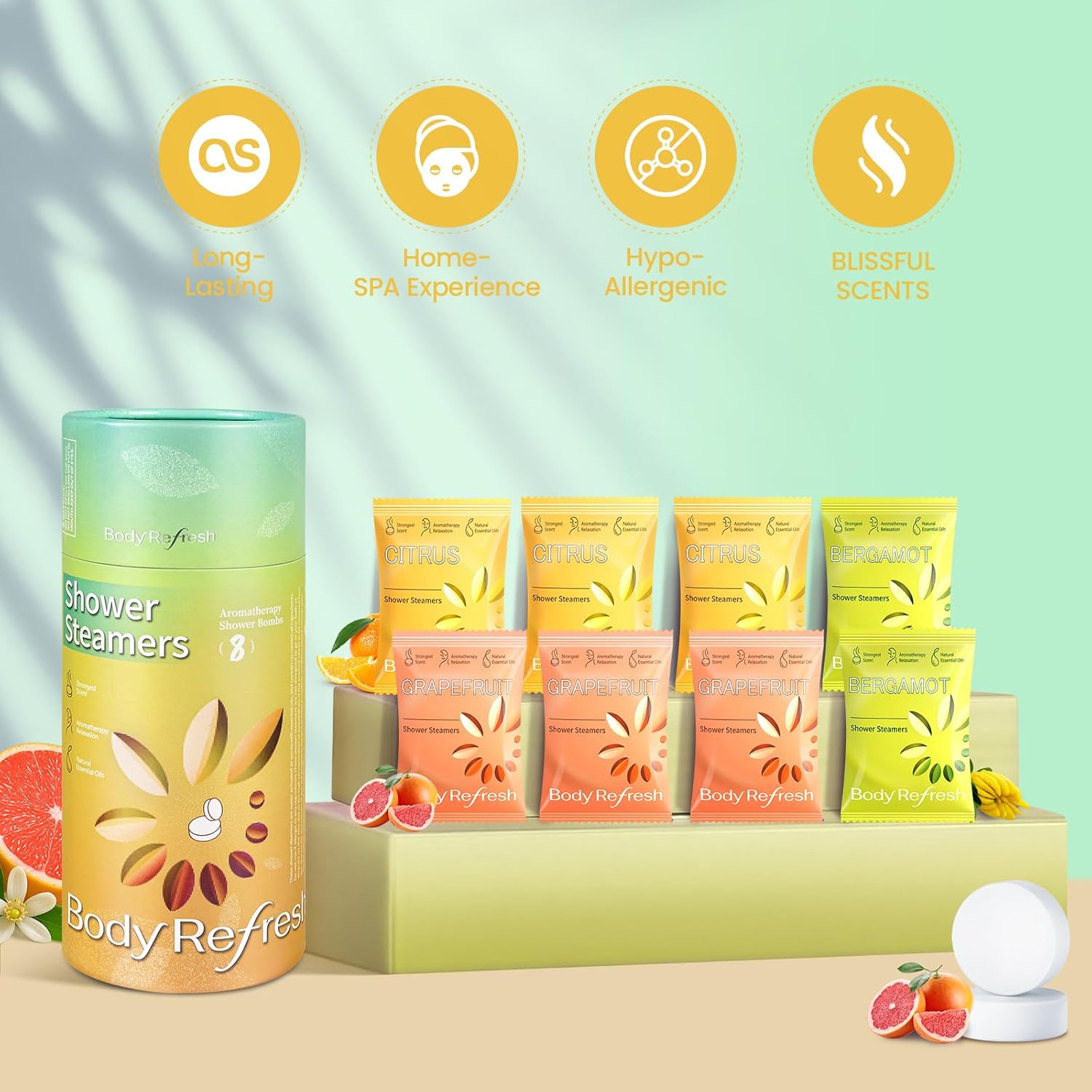 Four Natural & Soothing Scents – This set includes 8 shower steamers in 4 distinct fragrances : Grapefruit x3, Citrus x3, Bergamot x2. Allow the gentle aromas to envelop your senses and create a serene, spa-like atmosphere in your shower. Ideal as spa and self-care gifts for women.