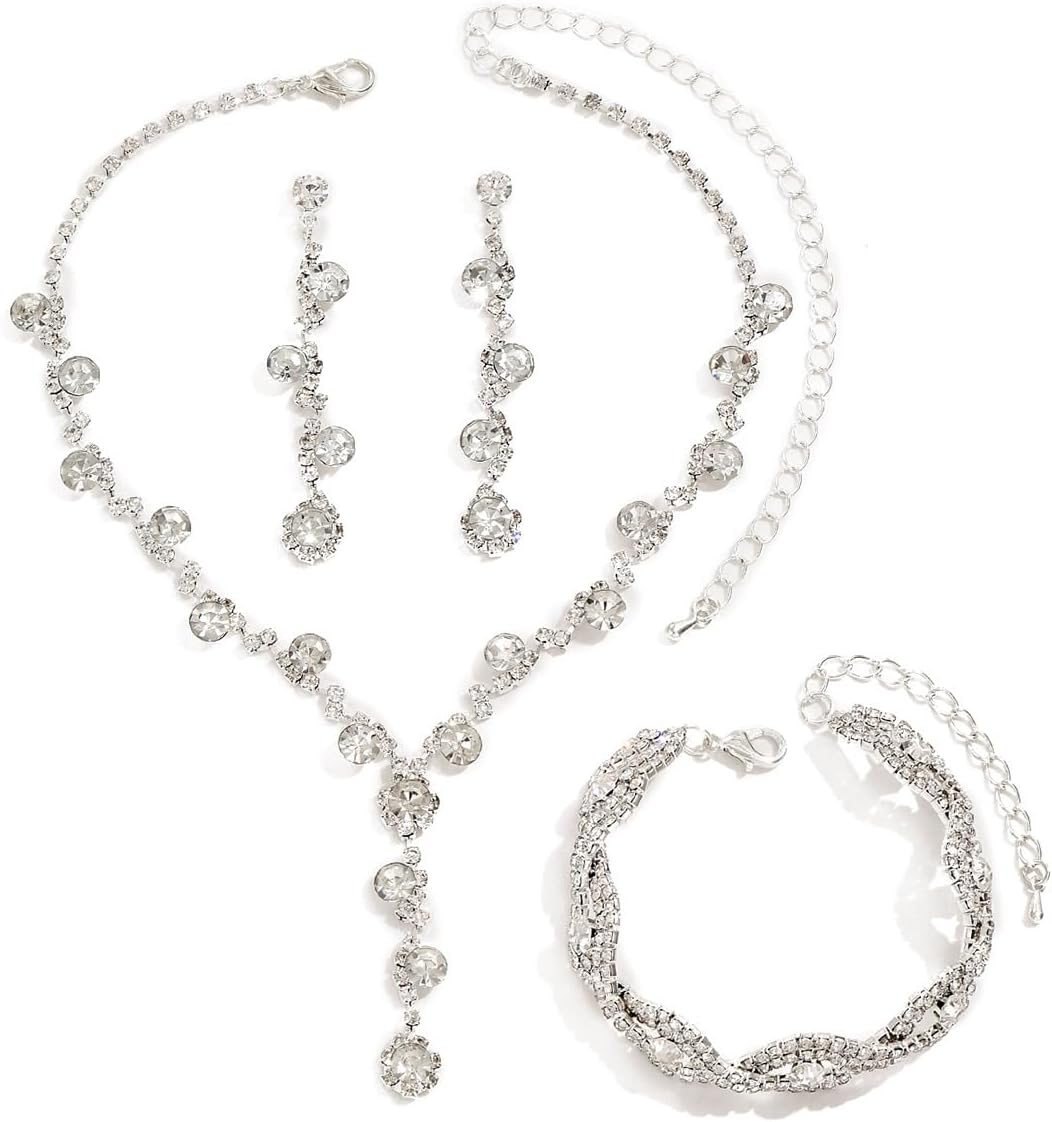 Silver Crystal Bridal Jewelry Set, Teardrop Dangle Earrings Rhinestone Necklace Bracelet for Bride Bridesmaid Crystal Bridal Wedding Party Jewelry Sets
