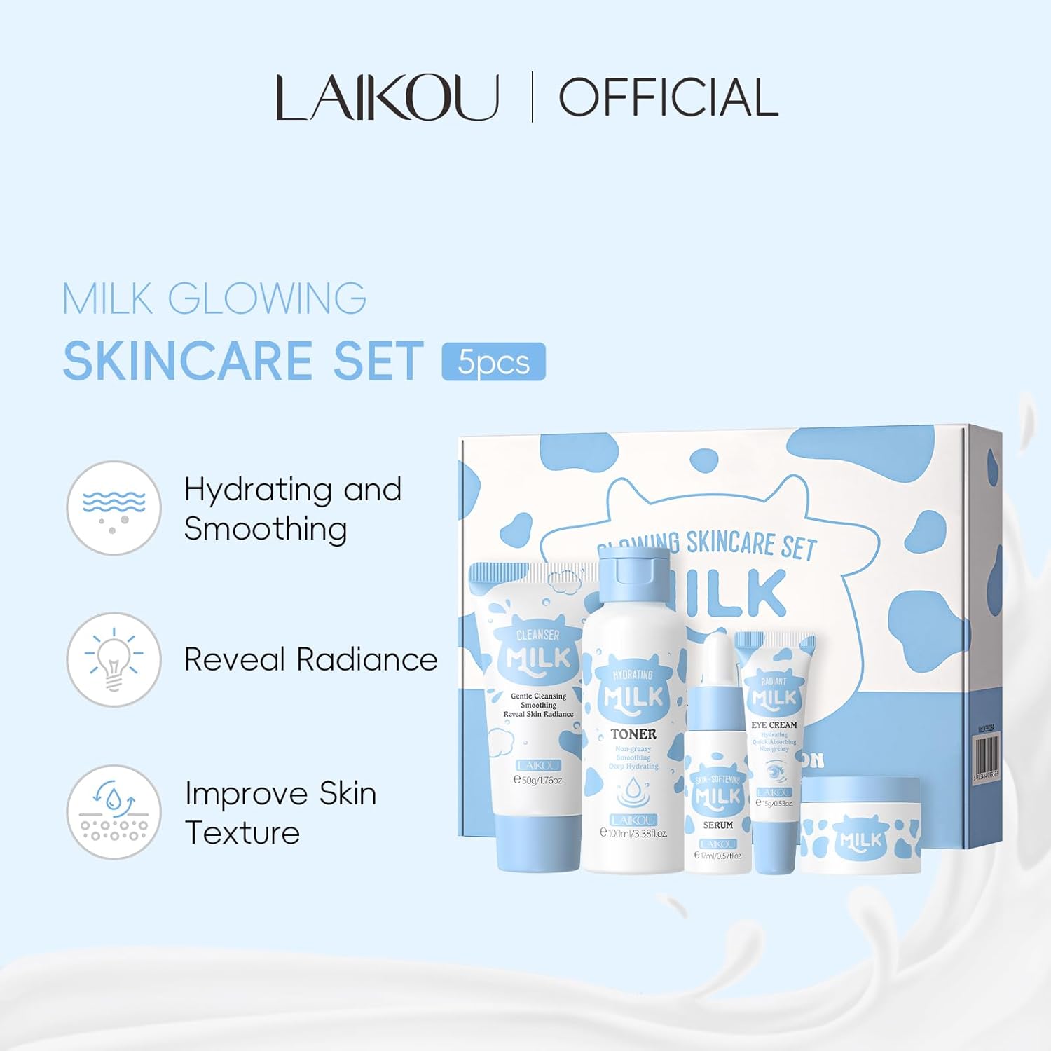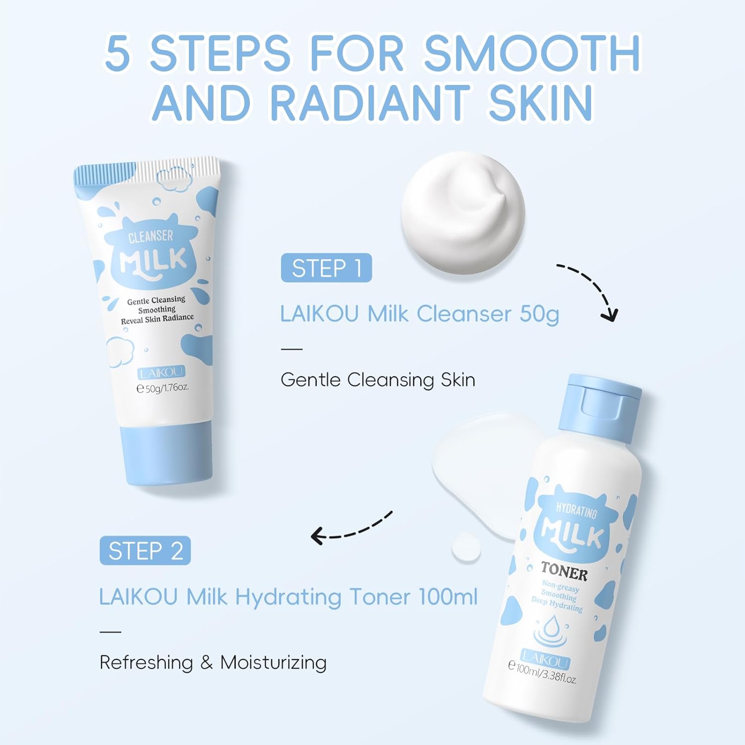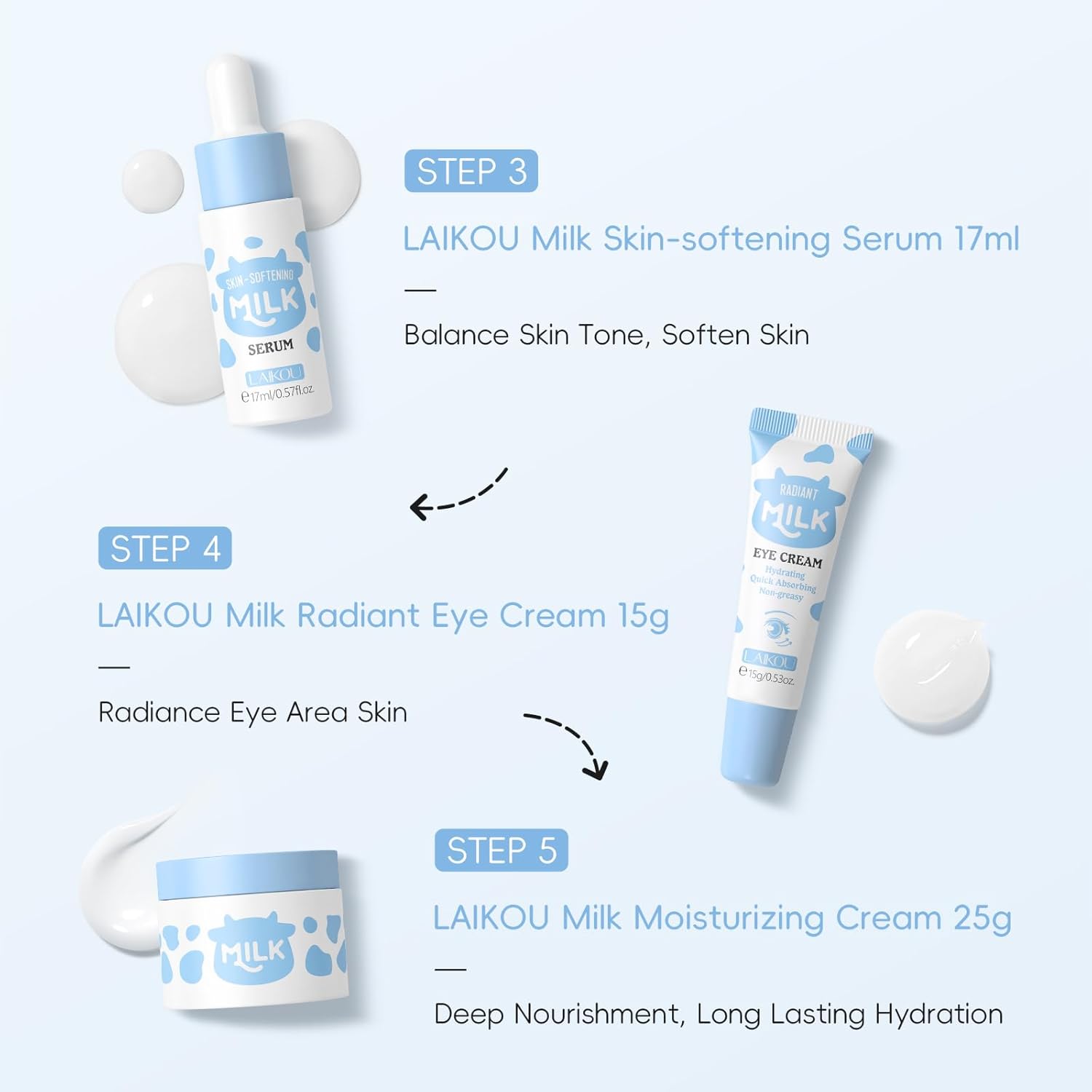 【Nourishing Formulas】Derived from milk extracts, LAIKOU skincare set makes skin feel plumper, moisturize your skin day and night.