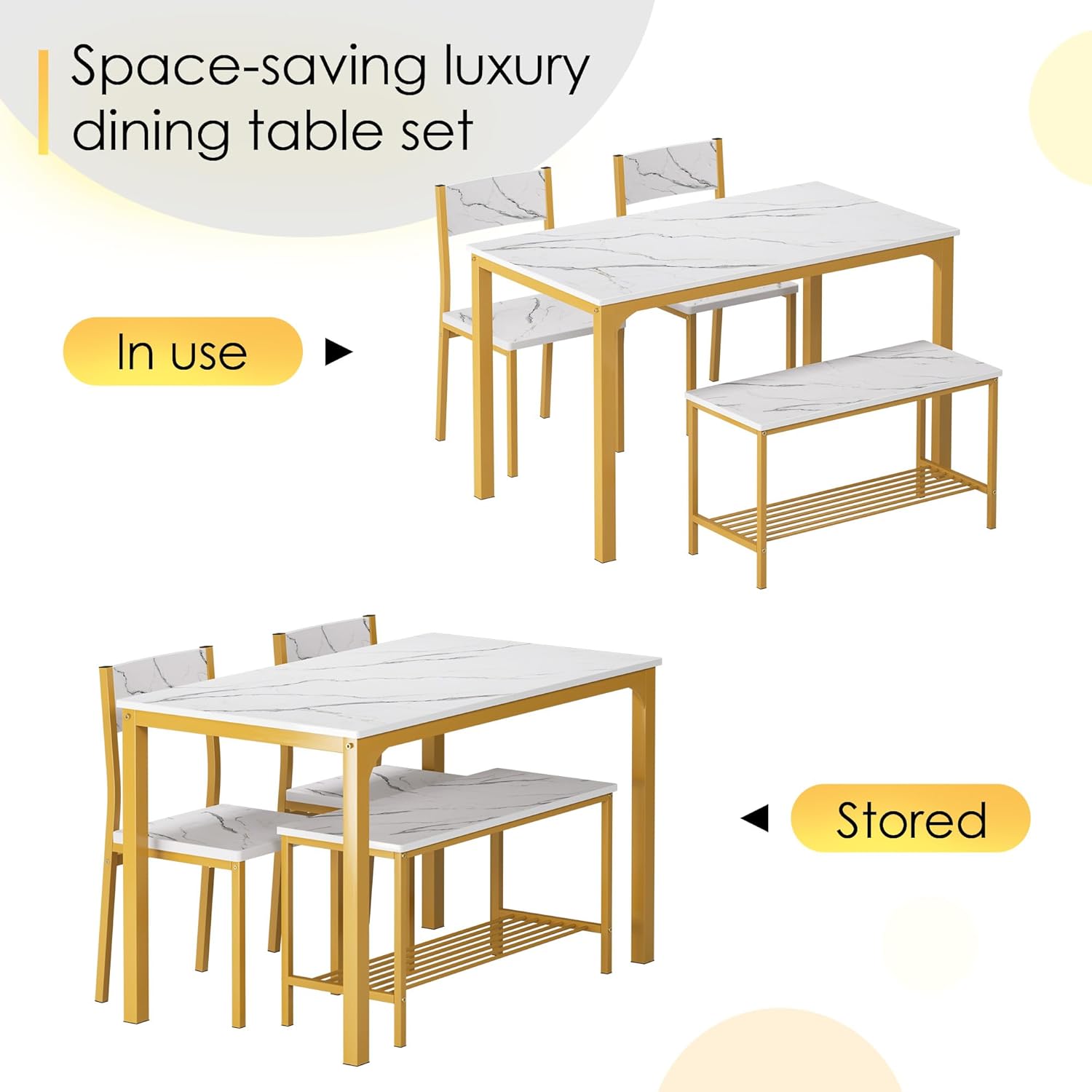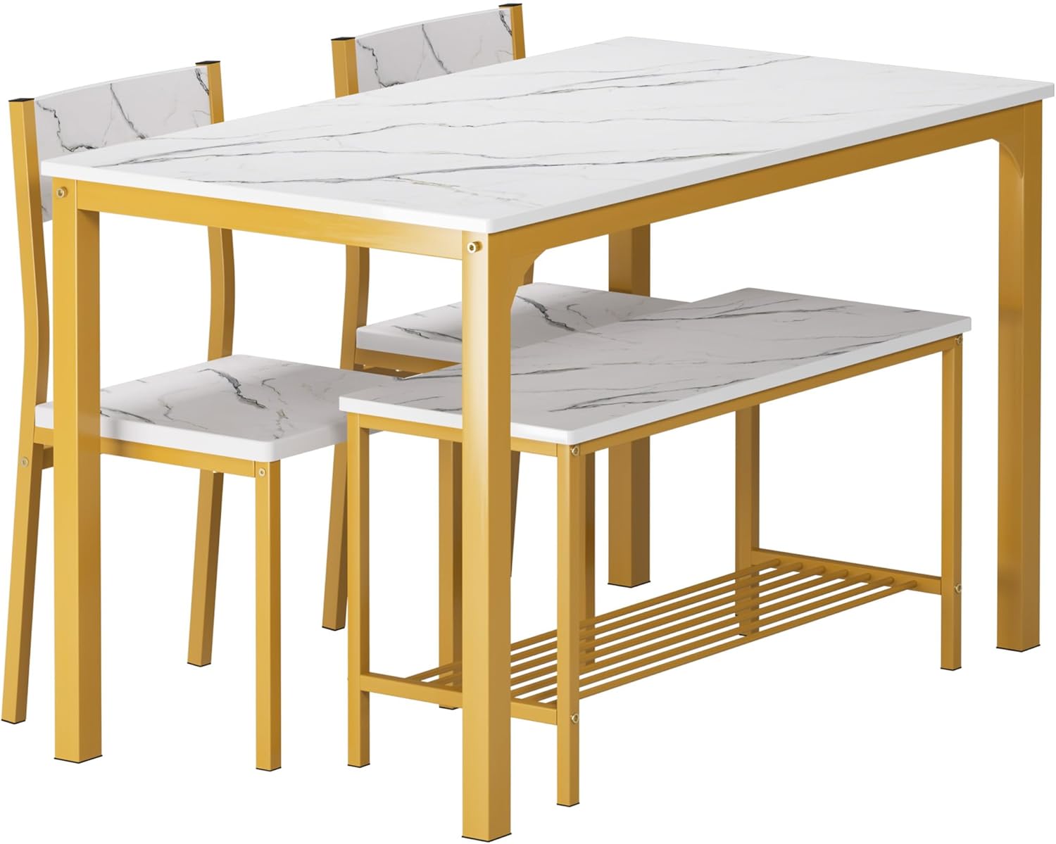 soges 4 Person Dining Table Set,43.3 inch Kitchen Table Set for 4,2 Chairs with Backrest,2-Person Bench with Storage Rack,Nesting Furniture Set for Dining Room and Restaurant, White Gold