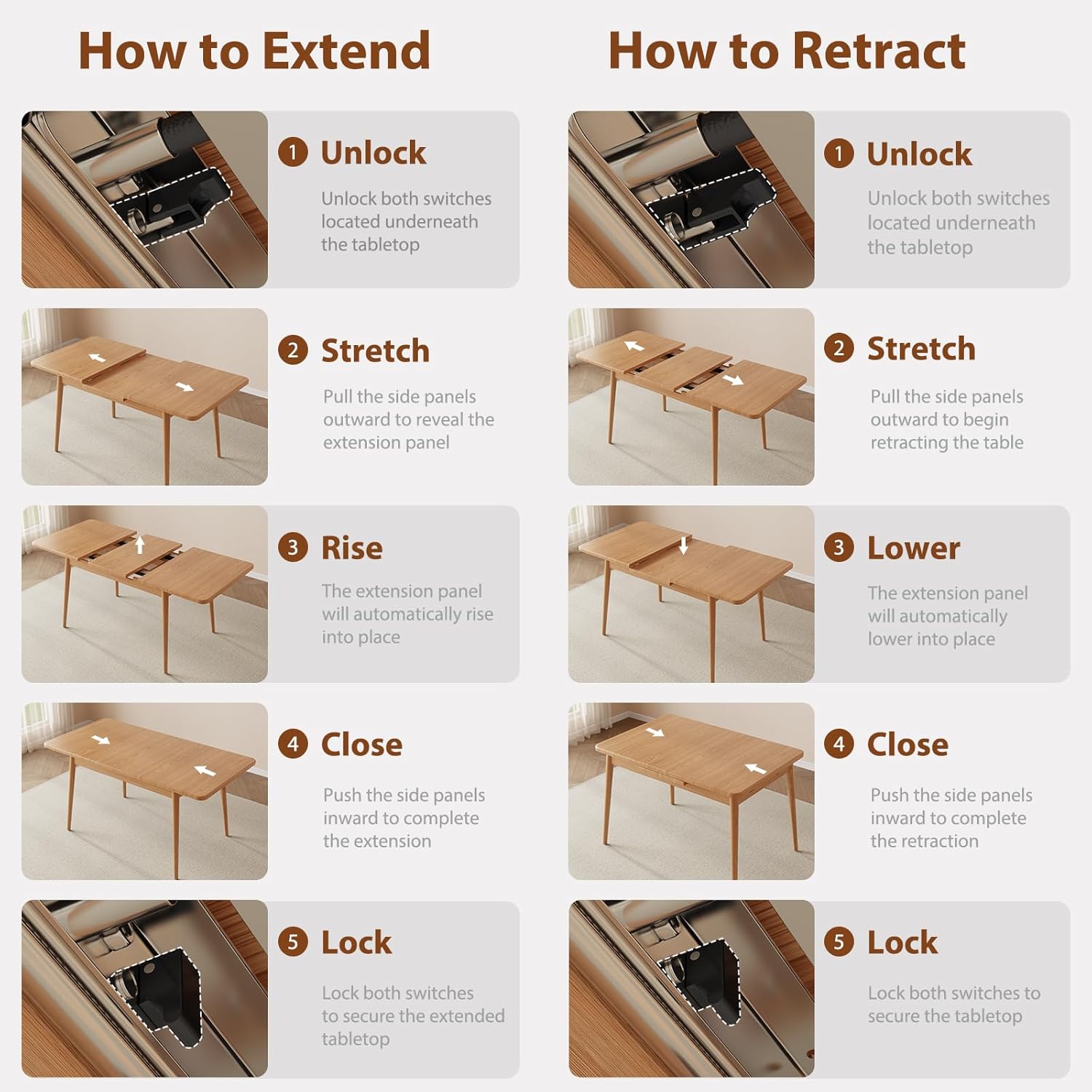 【SEAMLESS EXTENSION DESIGN】This table expands from 4 to 8 seats with a hidden extension mechanism. Simply pull the tops, and the panel rises automatically, creating a spacious dining area in seconds