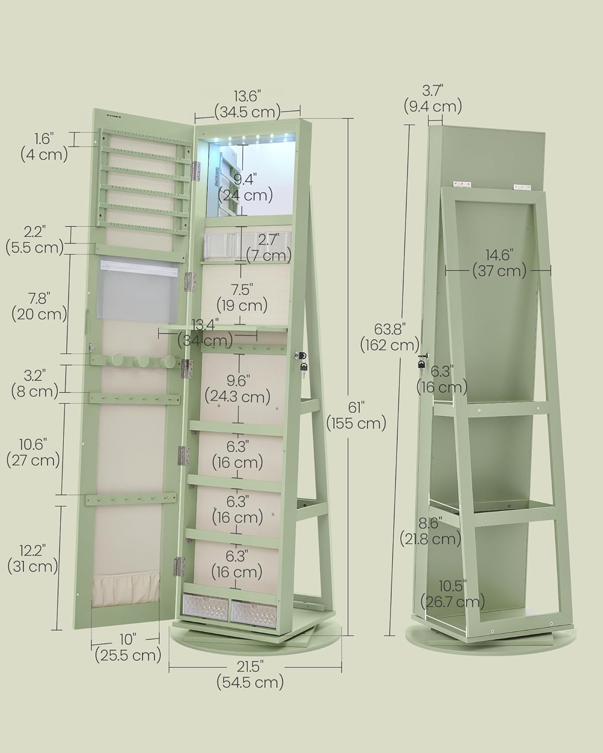 Be the first to review “SONGMICS 6 LEDs Lockable Mirror Jewelry Cabinet, 360° Swivel Jewelry Organizer Armoire Standing, Frameless Full-Length Mirror, 3 Storage Shelves, Laurel Green Surface, Cream White Lining UJJC007C01”