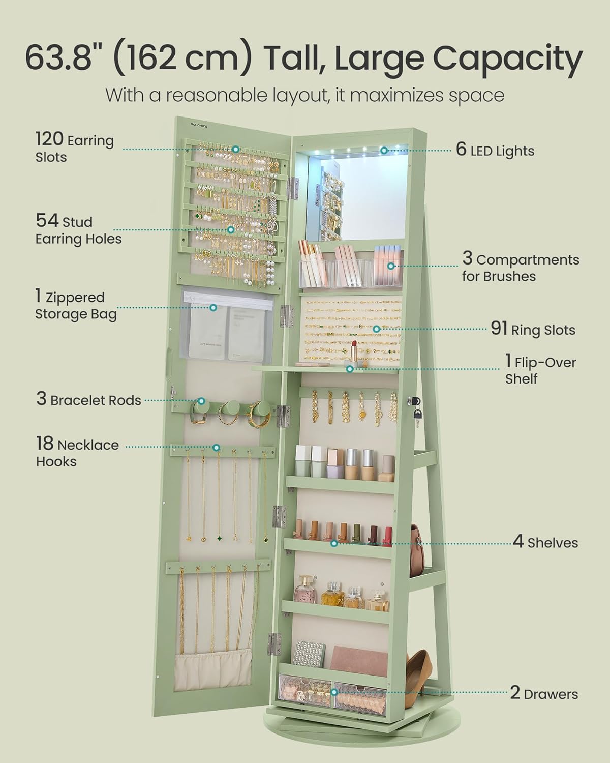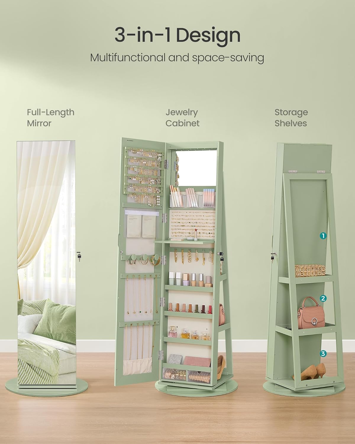 SONGMICS 6 LEDs Lockable Mirror Jewelry Cabinet, 360° Swivel Jewelry Organizer Armoire Standing, Frameless Full-Length Mirror, 3 Storage Shelves, Laurel Green Surface, Cream White Lining UJJC007C01