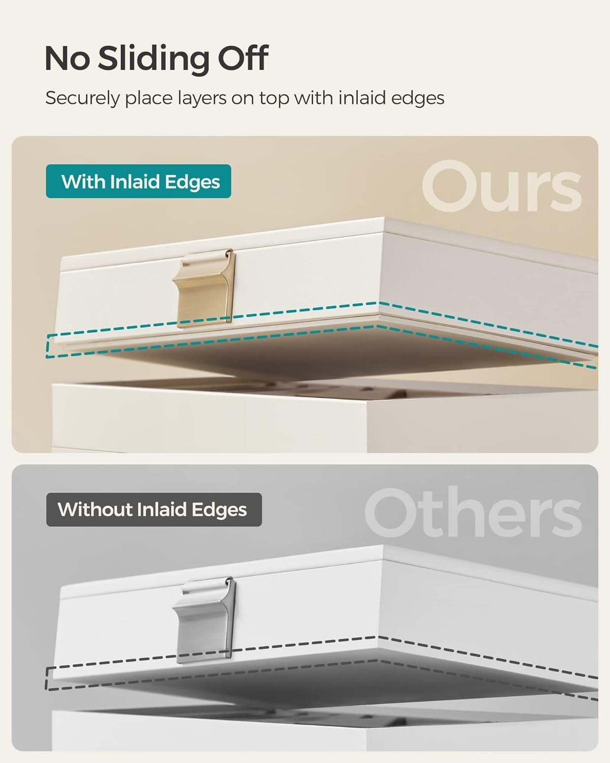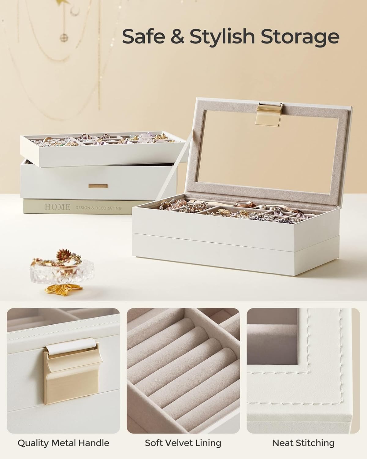 [Useful Details] With its dustproof transparent lid, you’ll be able to quickly find your jewelry with just a glance. The grooves on the bottom of the stackable jewelry trays help you place them on top of one another to save space