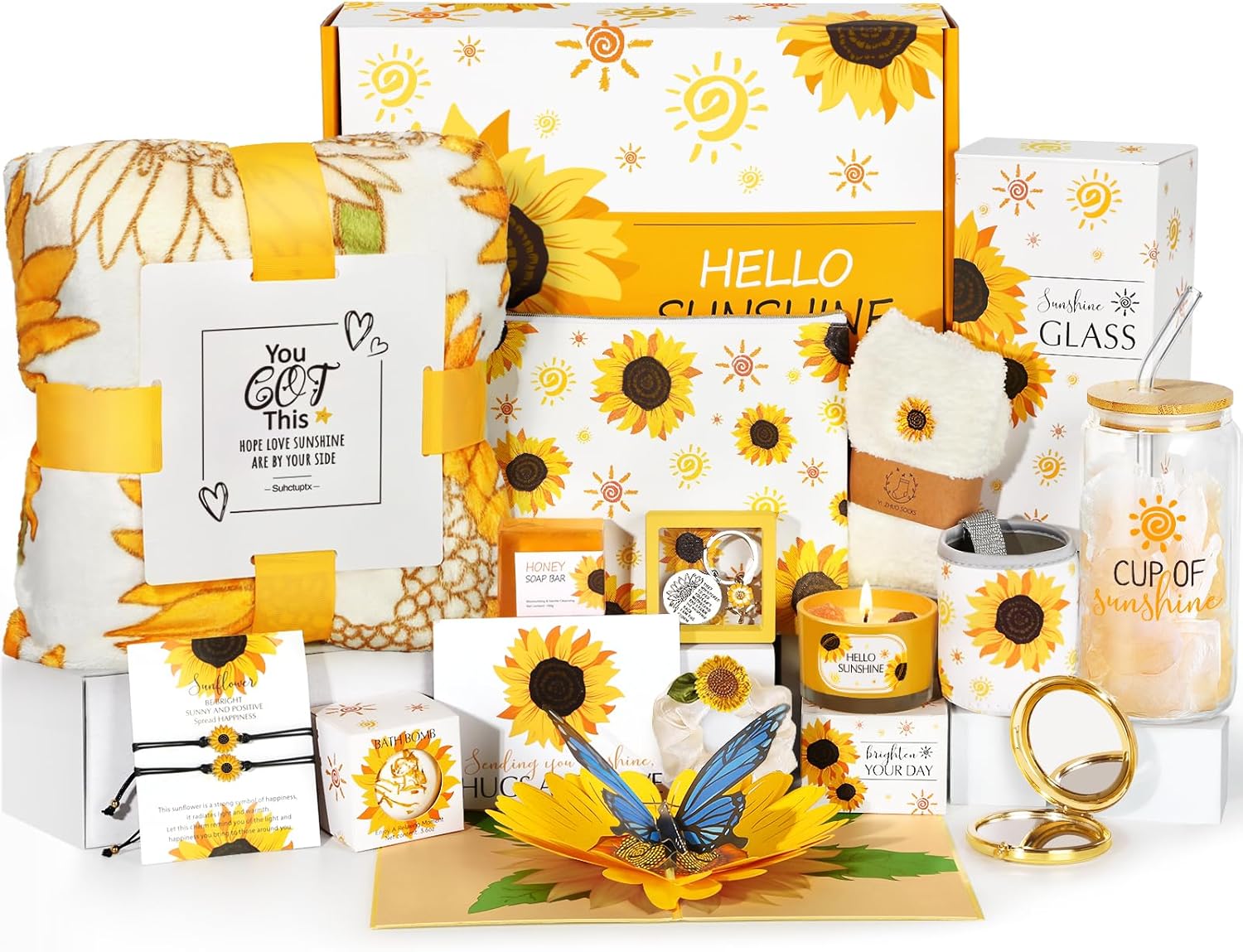 15 PCS SELF CARE GIFTS FOR WOMEN: (1)Sunflower Fleece Blanket, (2)16oz Glass Cups with Straw, (3)Cups Protective Cover, (4)Cosmetic Bag, (5)Fuzzy Socks, (6)Sunflower Bracelets, (7)Cosmetic Mirror, (8)Hair Scrunchie, (9)Crystal Scented Candle, (10)Motivational Keychain, (11)Bath Bomb, (12)Honey Soap Bar, (13)Small Greeting Card, (14)3D Pop Up Sunflower Butterfly Card, (15)Elegant Gift Box. A truly heartwarming and unique birthday gifts for her!