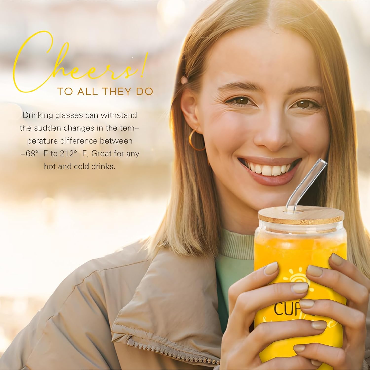 SUNSHINE GLASS CUP: A stylish 16 oz drinking cup printed with “a cup of sunshine” is the way to happy sipping! The glass is made of high-quality thick transparent glass, smooth, lead-free, crystal clear, and can withstand -68°F to 212°F The temperature difference between the two (dishwasher safe), she can DIY her favorite drinks, such as iced coffee, soda and juice, etc., also includes the lid, cup sleeve, straw and straw brush, provide her with everything for a pleasant drinking experience!