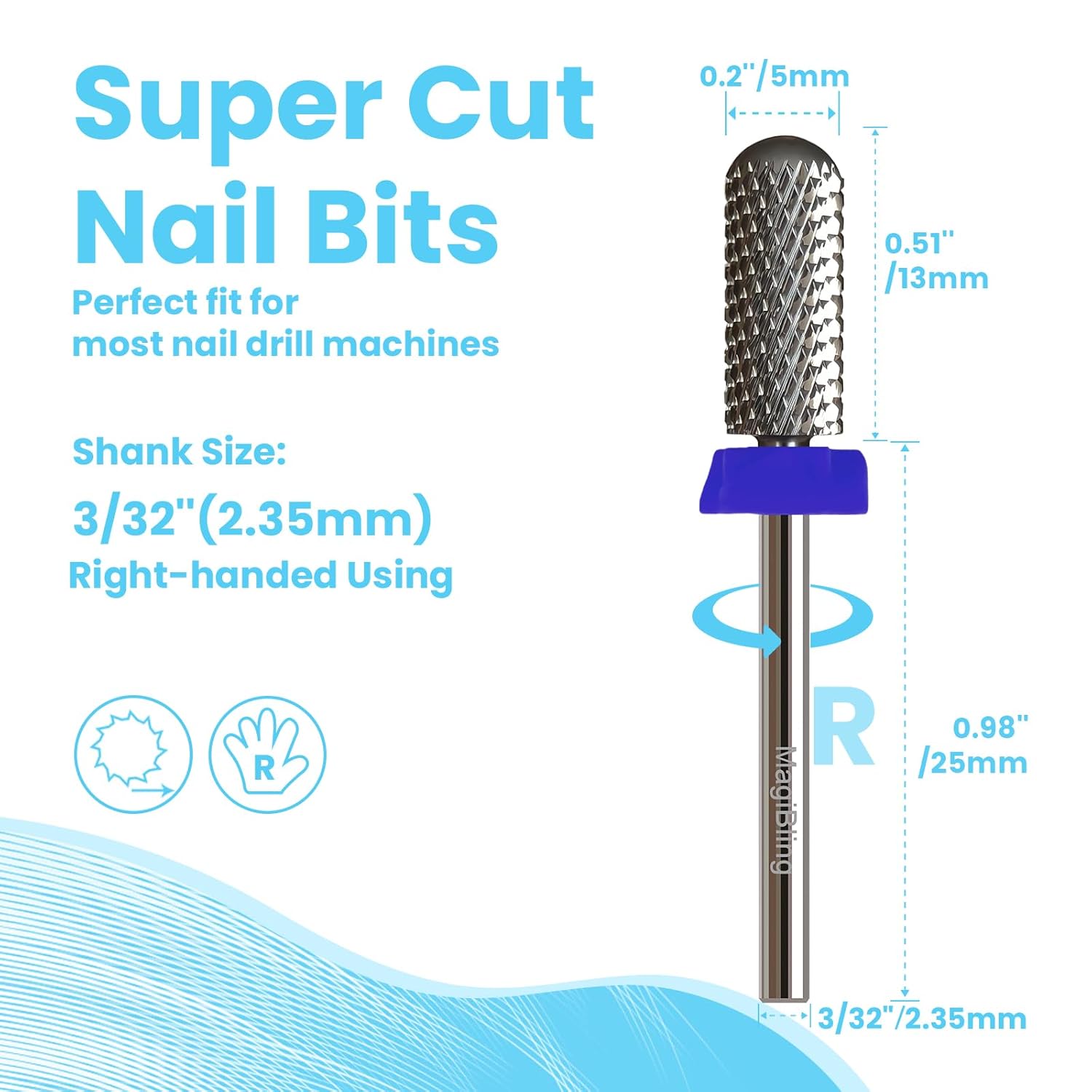 Super Cut Small Barrel 3/32” Safety Tungsten Nail Drill Bits, Remove Gel Fast, Right handed, Suitable for Manicure Pedicure Cuticle Gel Polishing, Classic Round Top Bits, Grit: Medium.