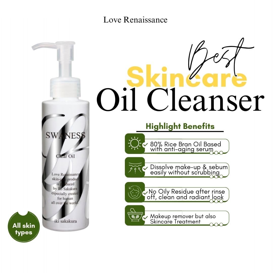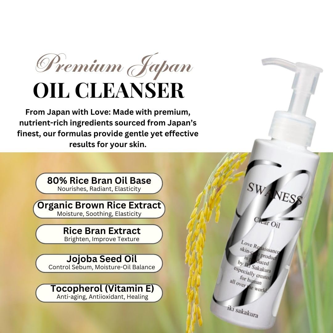SWANESS Clear Oil – Japanese Luxury Skincare Oil Cleanser Crafted in Japan by skincare artisans, SWANESS Clear Oil is a premium rice bran oil-based cleanser that reflects the art of Japanese beauty. This elegant, multi-functional formula effortlessly dissolves waterproof makeup, sunscreen, and deep-seated impurities—all while nourishing your skin with anti-aging care. Non-greasy and gentle enough for sensitive skin, it leaves your complexion feeling clean, soft, and glowing with radiance. Experience the perfect balance of traditional craftsmanship and modern skincare science.