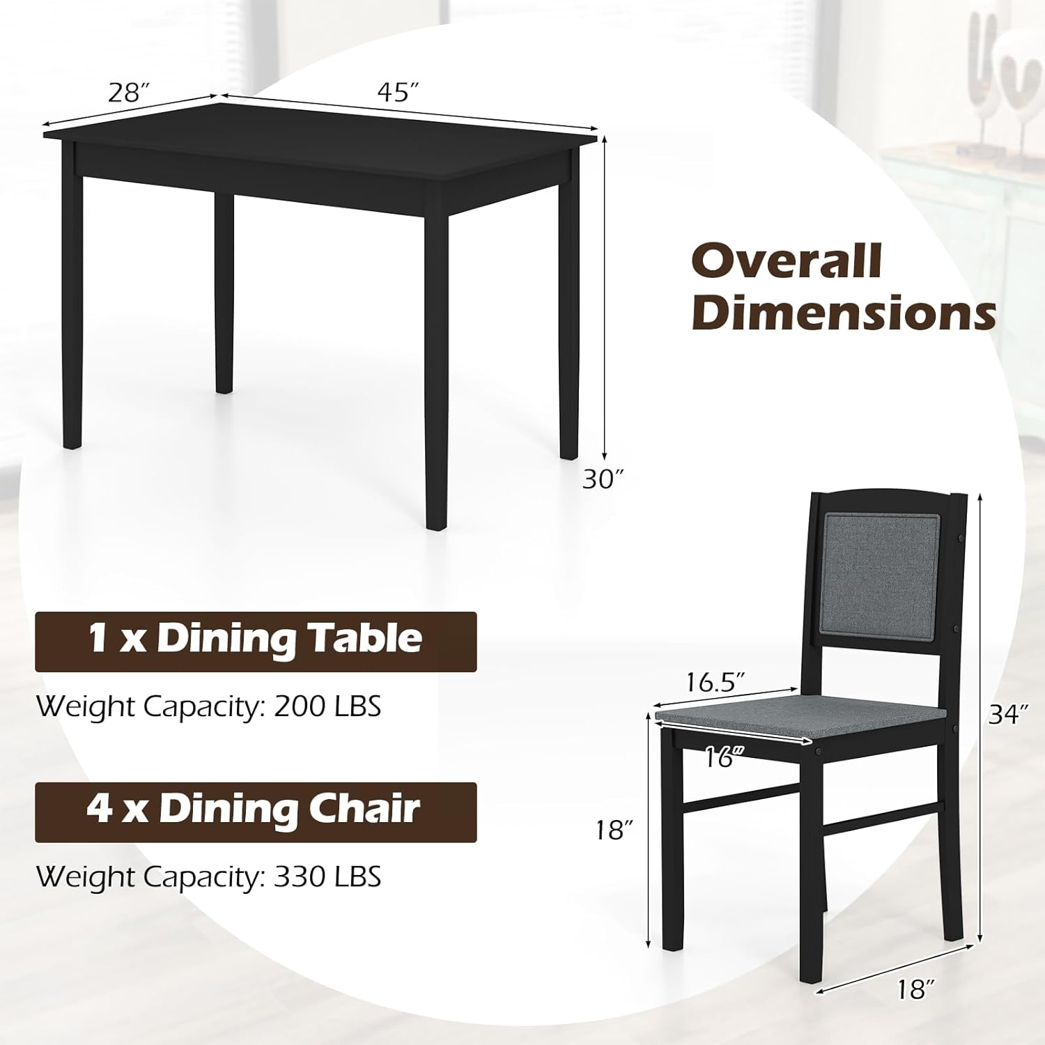 Includes 1 dining table and 4 dining chairs for family meals
