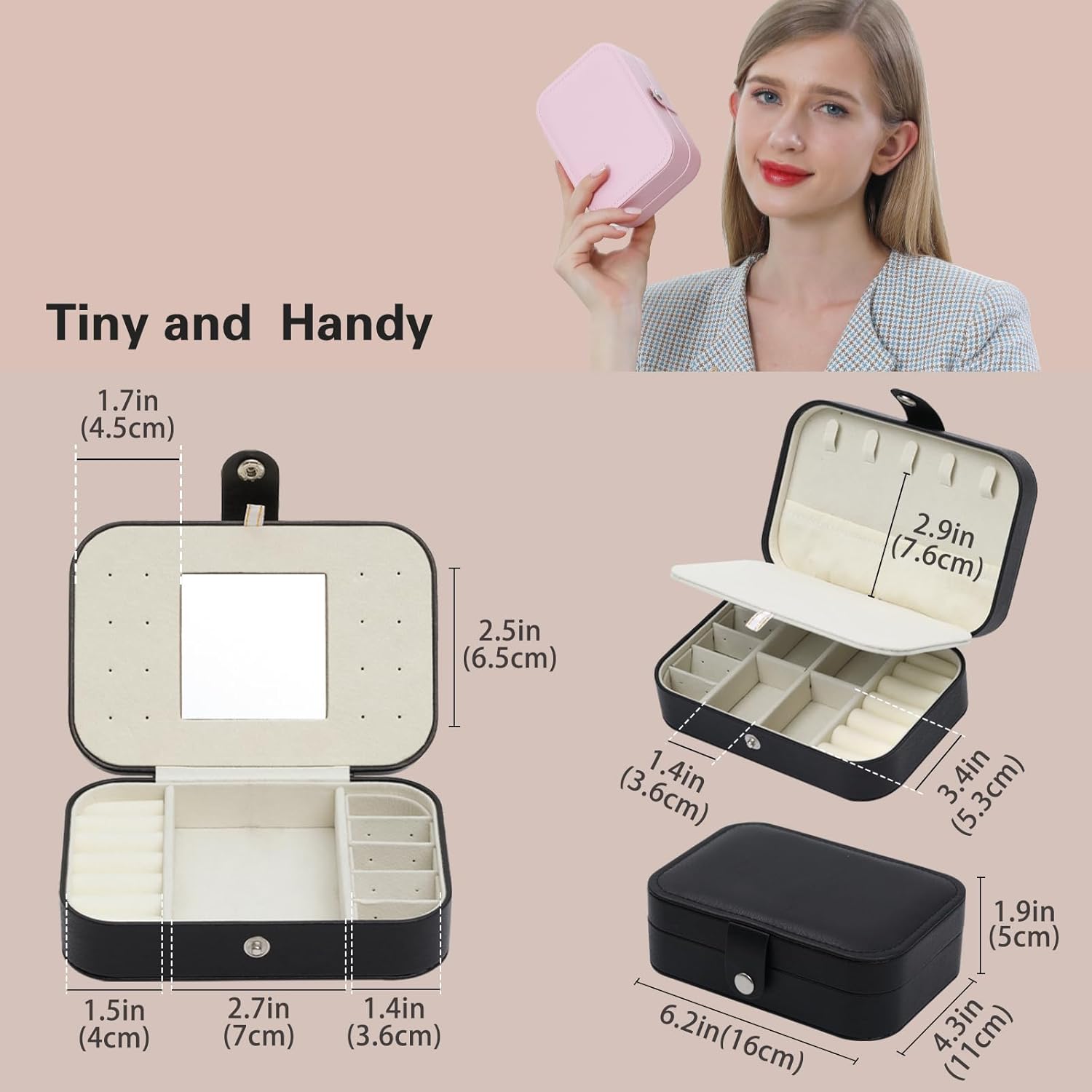 Ideal jewelry box – size 6.2*4.3*1.9 inches, small size but large capacity Double-layer structure, with 5 hooks on the top to place necklaces, a mirror in the middle and 16 holes for earrings and studs, 6 ring holes at the bottom and 6 compartments for brooches, lipsticks, watches, etc.