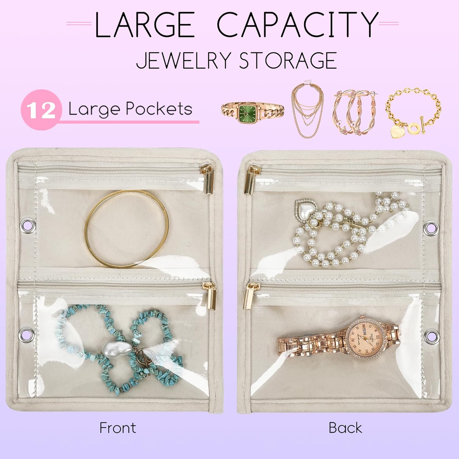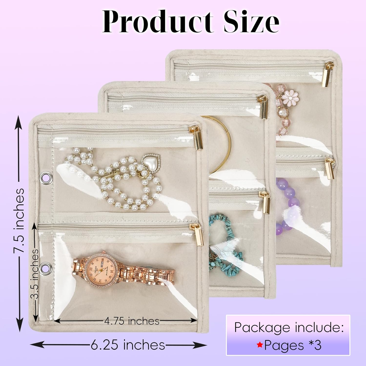 【WELL-PROTECTED JEWELRY POUCHES】3 pcs soft velvet material inner pages with individual zipper closure provide extra protection to prevent your jewelry from falling out, getting lost, or getting damaged. The pages includes 12 large pouches for hoop earrings, bracelets, necklaces, and chains.