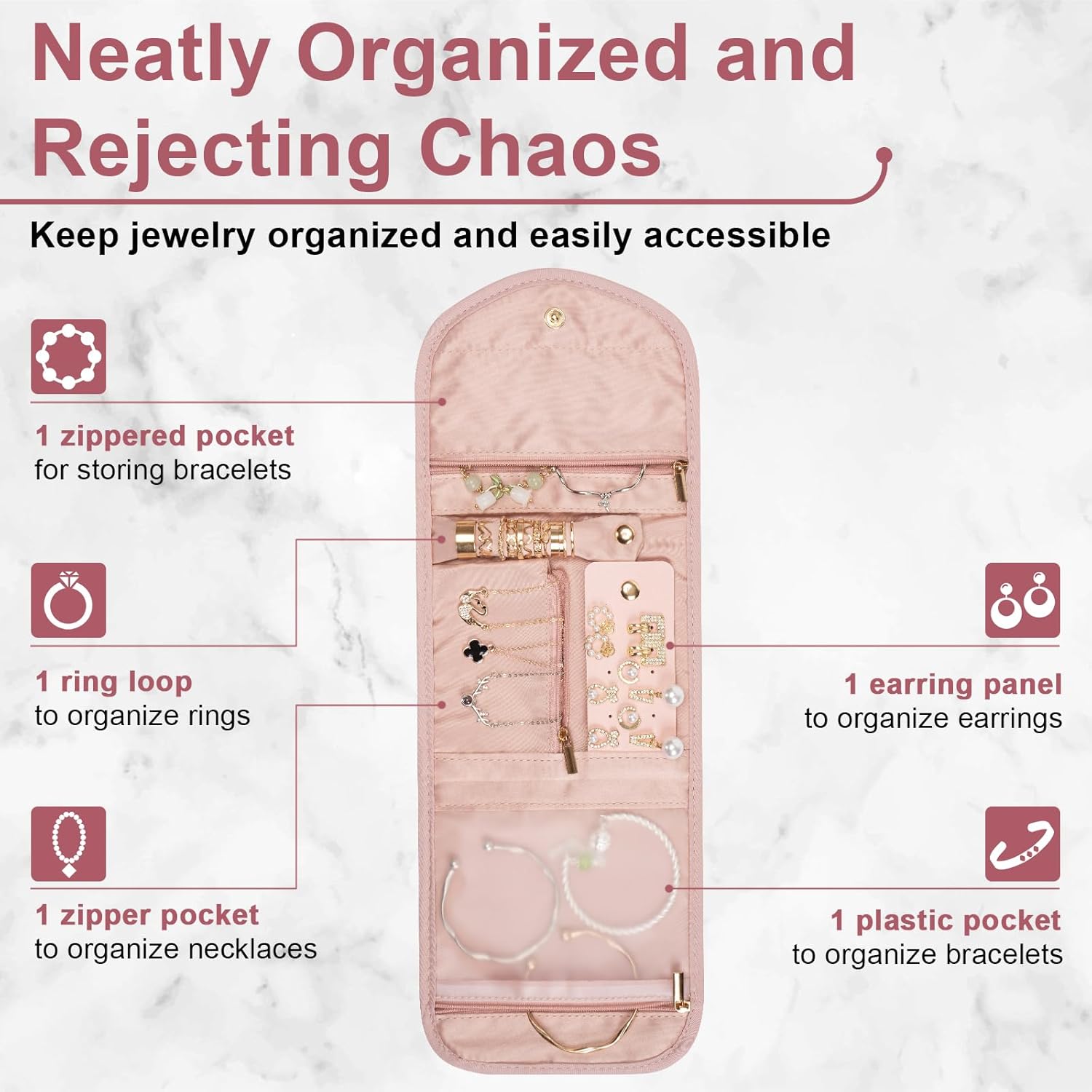 REASONABLE PARTITION: The small jewelry organizer have 4 places: 1 ring buckle, 1 earring place, 1 clear plastic pocket and 2 zipper pockets. It can separate your jewelry to prevent mess and keep your jewelry in order