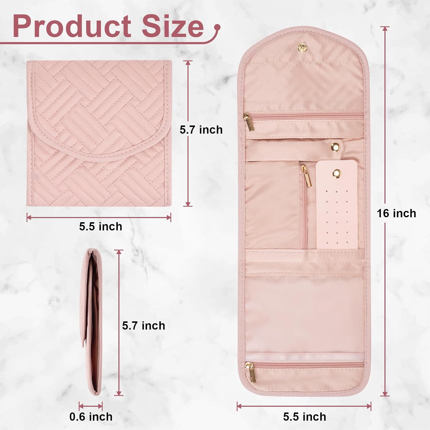 PRACTICAL DESIGN: Unfolded: 16 x 5.5 inches, folded: 5.5 x 5.7 inches. This jewelry organizer is small and beautiful, without affecting the use of space; suitable for travel or business with you, convenient for your life