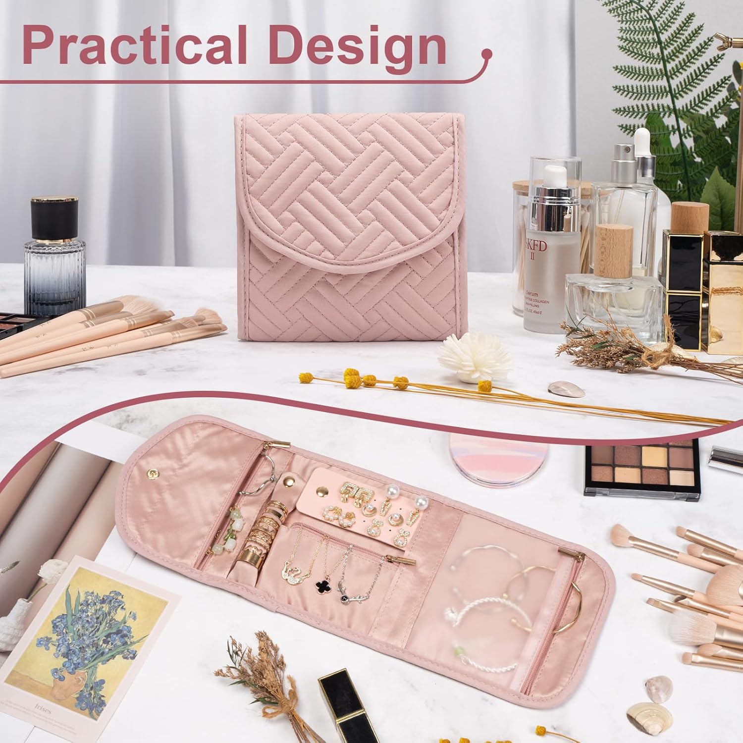 PROTECT JEWELRY: The area of the jewelry keeper has a protective design that prevents jewelry from falling out of the bag and keep it safe. And there are more useful zippered pockets to place to place whatever you need