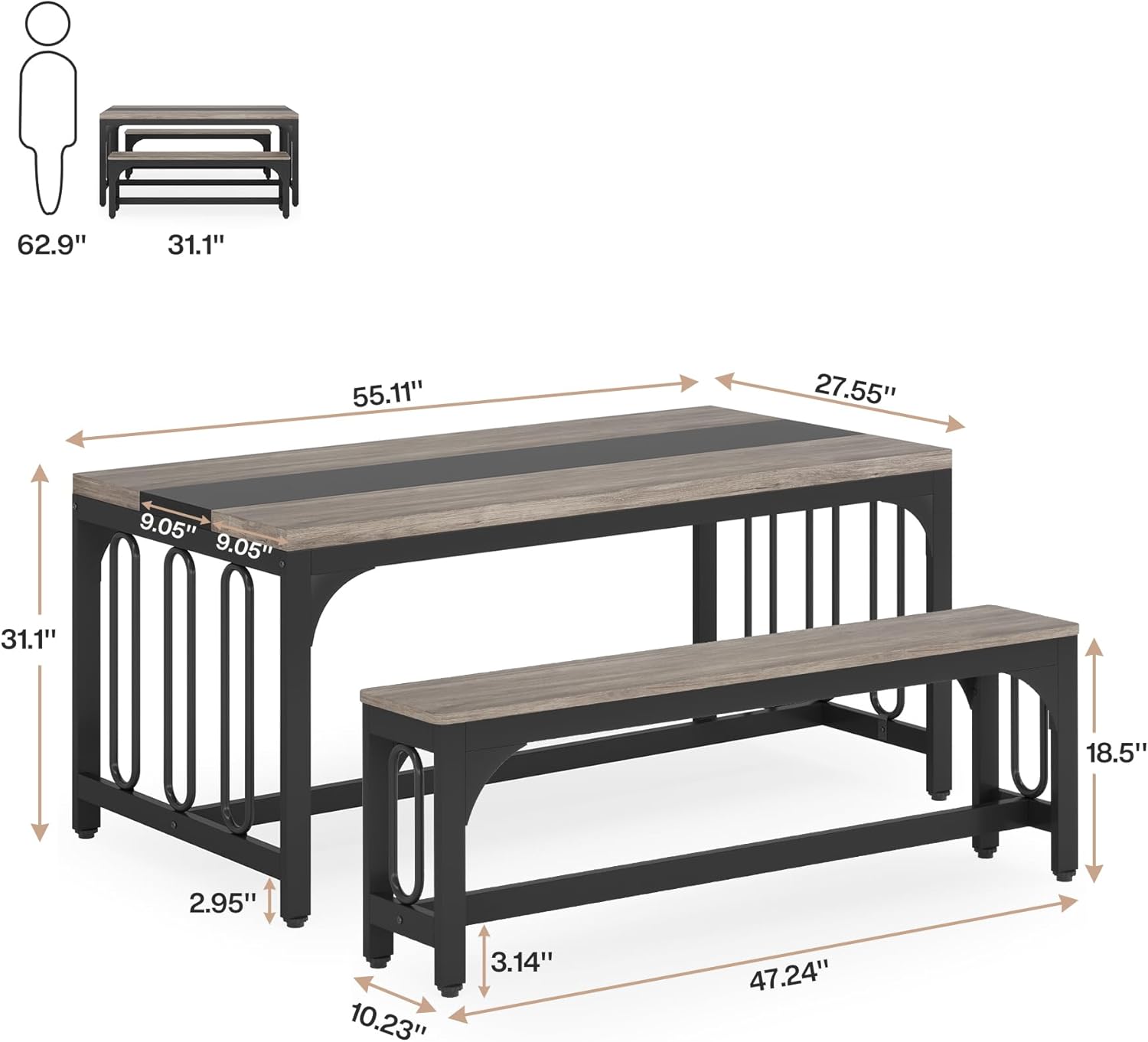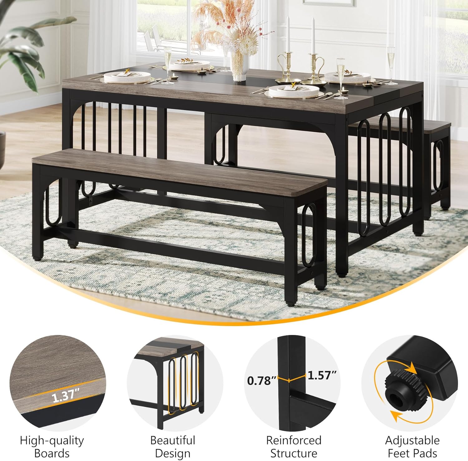 Safe Material: E0-graded Particle Board + Thicker Steel Table Dimension: 55โ W*27.5โ D*31.1โ H Bench Dimension: 47.24โ W*10.23โ D*18.5โ H Color: Grey Thicken Board: 1.37″ Weight Capacity: Table: 350 lbs; Bench: 550 lbs Product Weight: 91 lbs What’s Included: 1 x Dining Table, 2 x Bench, 1 x Hardware and Assembly Instruction Product Support Details 18 months Customer Support 24-Hour Support Provided