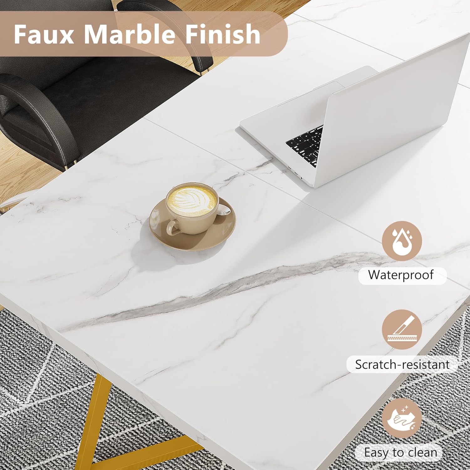 Beautiful faux marble veneering tabletop, features waterproof, scratch-resistent and easy to clean with wet towel.