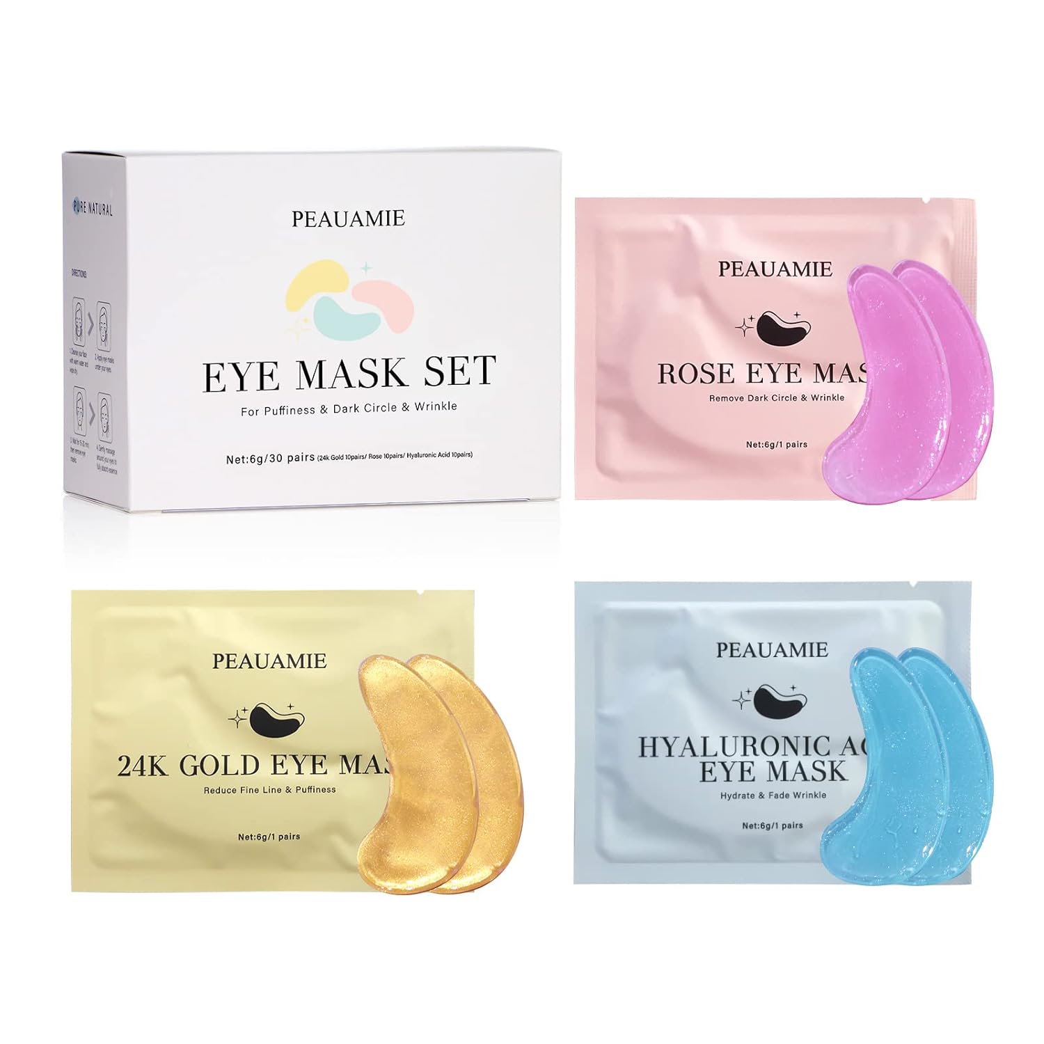 Independent Packaging: This product contains 10 pairs of rose eye mask, 10 pairs of hyaluronic acid eye mask, and 10 pairs of 24K gold eye mask. 24K Gold Eye Mask helps rejuvenate the eye-contour skin, such as fine line and puffiness. Hyaluronic Acid Eye Mask helps hydrate skin and fade wrinkle. Rose Eye Mask helpsto remove dark circle.Each pair of eye mask is independent packaging to ensure that it will not be contaminated